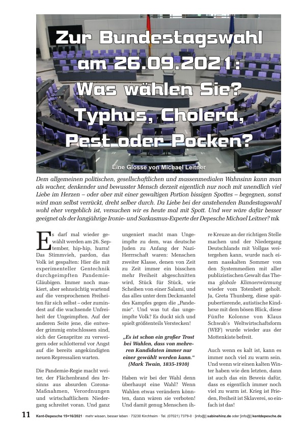 Dem allgemeinen Wahnsinn kann man als denkender Mensch derzeit nur noch mit unendlich viel Liebe im Herzen – oder aber mit einer gewaltigen Portion bissigen Spottes – begegnen, sonst wird man selbst verrückt. Da Liebe bei der anstehenden Bundestagswahl eher vergeblich sein dürfte, versuchen wir es mal mit Spott. Und wer wäre dafür besser geeignet als der langjährige Ironie- und Sarkasmus-Experte der Depesche Michael Leitner?