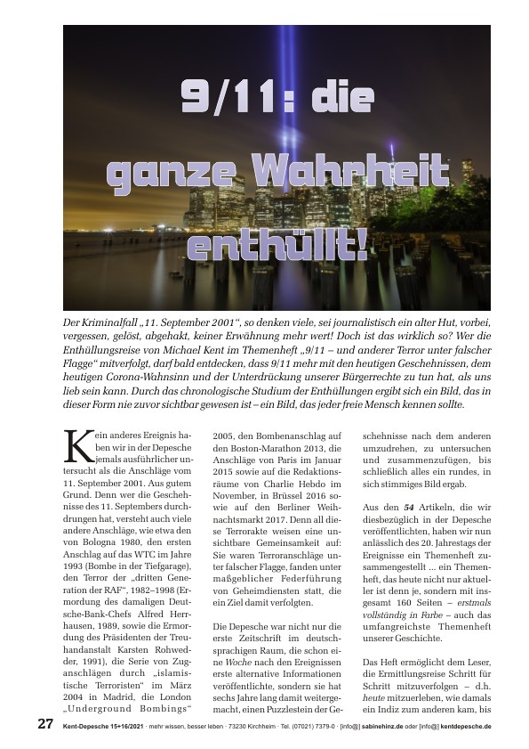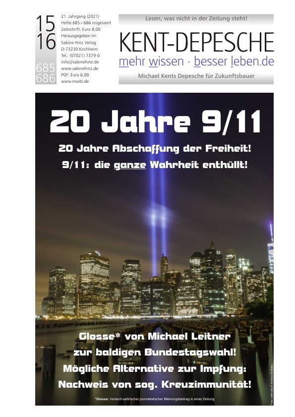 Der Kriminalfall „11. September 2001“, so denken viele, sei journalistisch ein alter Hut, vorbei, vergessen, abgehakt! Wirklich? Wer die Enthüllungsreise von Michael Kent im Themenheft „9/11 – und anderer Terror unter falscher Flagge“ mitverfolgt, darf bald entdecken, dass 9/11 mehr mit den heutigen Geschehnissen, dem heutigen Corona-Wahnsinn und der Unterdrückung unserer Bürgerrechte zu tun hat, als uns lieb sein kann. Durch das chronologische Studium der Enthüllungen ergibt sich ein Bild, das in dieser Form nie zuvor sichtbar gewesen ist – ein Bild, das jeder freie Mensch kennen sollte.