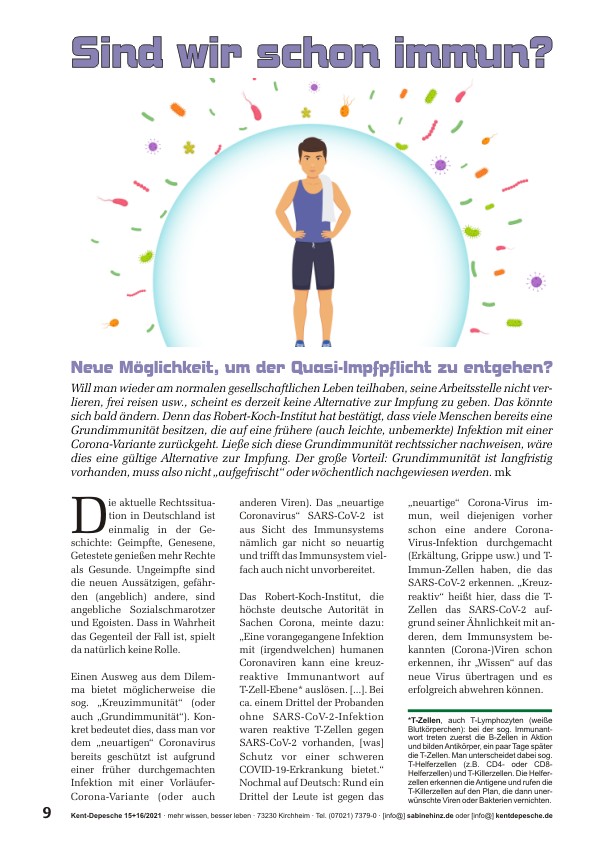 Will man am „normalen“ Leben teilhaben, seine Arbeitsstelle nicht verlieren, frei reisen usw., scheint es derzeit keine Alternative zur Impfung zu geben. Das könnte sich bald ändern. Denn das RKI hat bestätigt, dass viele Menschen eine Grundimmunität besitzen, die auf eine frühere (auch leichte, unbemerkte) Infektion mit einer Corona-Variante zurückgeht. Ließe sich diese Grundimmunität rechtssicher nachweisen, wäre dies eine gültige Alternative zur Impfung. Der große Vorteil: Grundimmunität ist langfristig vorhanden, muss also nicht „aufgefrischt“ oder wöchentlich nachgewiesen werden.