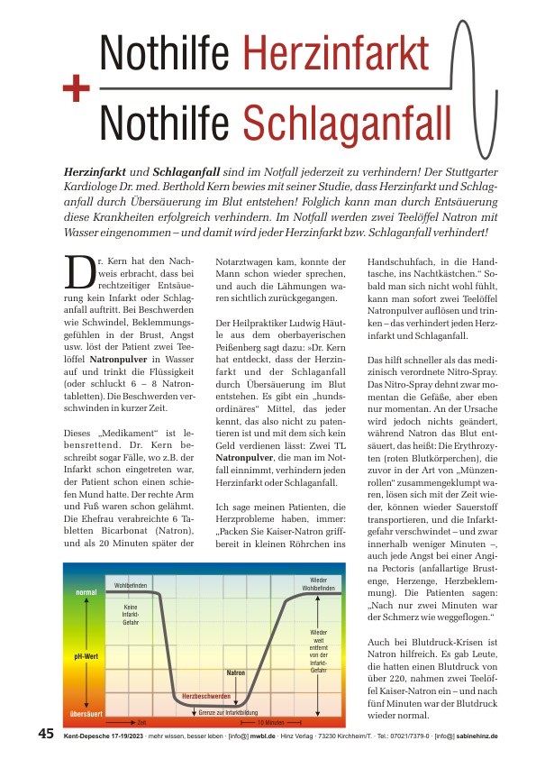 Herzinfarkt und Schlaganfall sind im Notfall jederzeit zu verhindern! Der Stuttgarter Kardiologe Dr. med. Berthold Kern bewies mit seiner Studie, dass Herzinfarkt und Schlaganfall durch Übersäuerung im Blut entstehen! Folglich kann man durch Entsäuerung diese Krankheiten erfolgreich verhindern. Im Notfall werden zwei Teelöffel Natron mit Wasser eingenommen – und damit wird jeder Herzinfarkt bzw. Schlaganfall verhindert!«