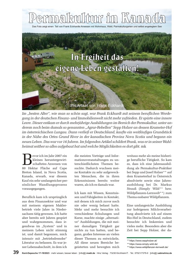 »Im besten Alter war Frank Eckhardt mit seinem beruflichen Werdegang in der deutschen Finanz- und Immobilienwelt nicht mehr zufrieden. Er spürte eine innere Leere. Dieser entkam er durch mehrjährige Ausbildungen im Bereich der Permakultur, u.a. noch beim „Agrar-Rebellen“ Sepp Holzer an dessen Krameter-Hof im österreichischen Lungau. Dann verließ er Deutschland, kaufte ein weitläufiges Grundstück in der Nähe des Ortes Grand River in der kanadischen Provinz Nova Scotia und begann ein neues Leben. Das war vor 16 Jahren. Im folgenden Artikel schildert Frank, was er in seiner Wahlheimat seither so alles aufgebaut hat und welche Möglichkeiten es dort gibt.«