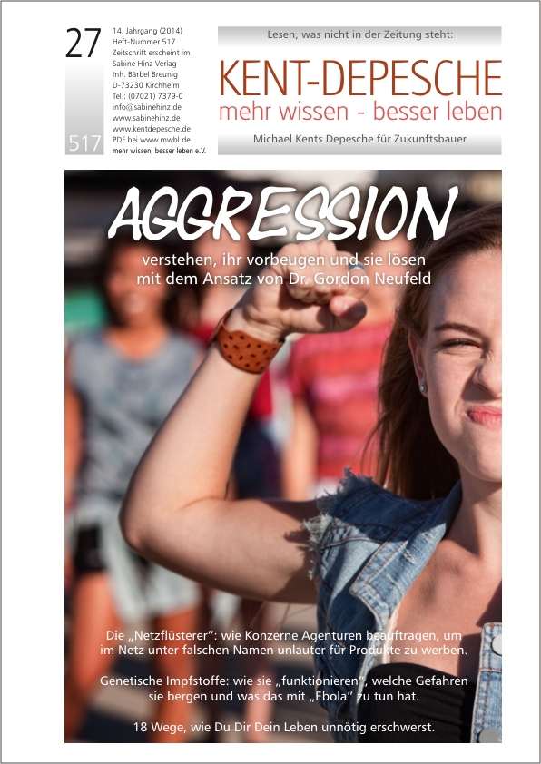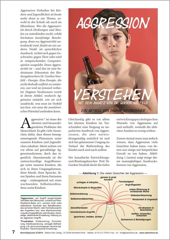 »Aggressives Verhalten bei Kindern und Jugendlichen ist heute mehr denn je ein Thema, sowohl in der Schule als auch im Elternhaus. Wer die Aggressivität durch Drohungen und Strafen zu unterbinden sucht, erlebt höchstens kurzfristige Beruhigung, denn wo Aggressivität unterdrückt wird, findet sie ein anderes Ventil: im sprachlichen Ausdruck, richtet sich gegen Geschwister, gegen Tiere oder wird in entsprechenden Computerspielen ausgelebt. Denn Aggressivität ist – und das ist eine bedeutsame Erkenntnis des Bindungsforschers Dr. Gordon Neufeld – Energie. Eine Energie, die nicht deshalb aufhört zu existieren, nur weil sie jemand verbietet. Dagmar Neubronner verrät in ihrem Artikel, wodurch Aggression entsteht, wie sie sich ausdrückt, was man im Vorfeld tun bzw. wie man ihr zerstörerisches Potential umlenken kann.«