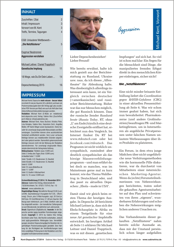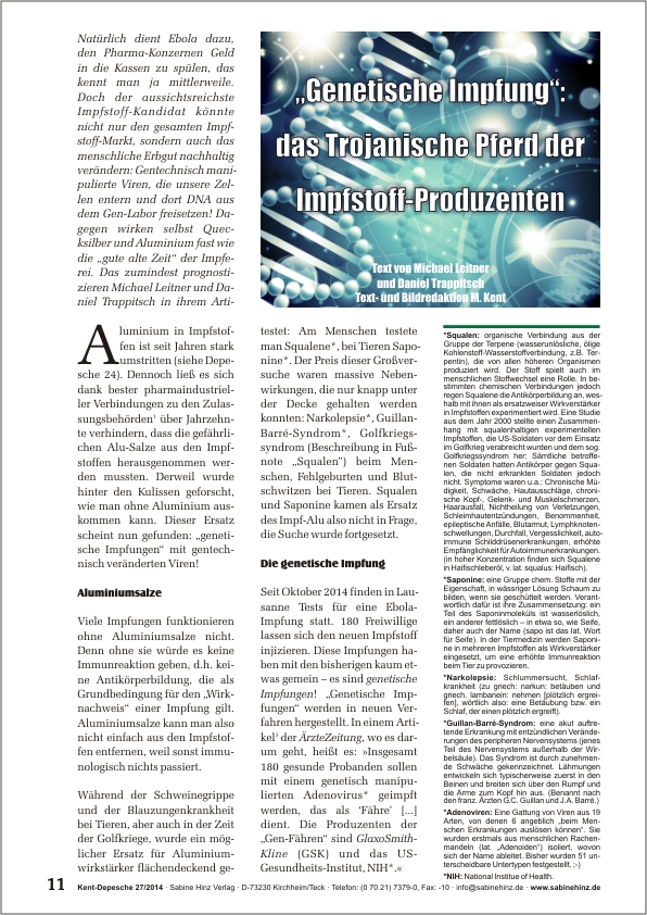 »Ebola dient dazu, den Pharma-Konzernen Geld in die Kassen zu spülen – das kennt man ja mittlerweile. Doch der aussichtsreichste Impfstoff-Kandidat könnte nicht nur den gesamten Impfstoff-Markt, sondern auch das menschliche Erbgut nachhaltig verändern: Gentechnisch manipulierte Viren, die unsere Zellen entern und dort DNA aus dem Gen-Labor freisetzen! Dagegen wirken selbst Quecksilber und Aluminium fast wie die „gute alte Zeit“ der Impferei. Das zumindest prognostizieren Michael Leitner und Daniel Trappitsch in ihrem Artikel.«