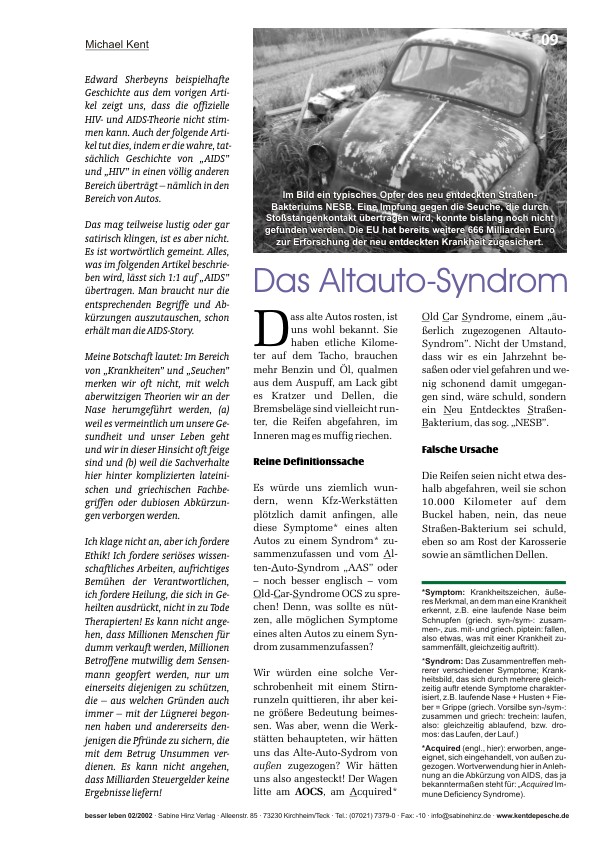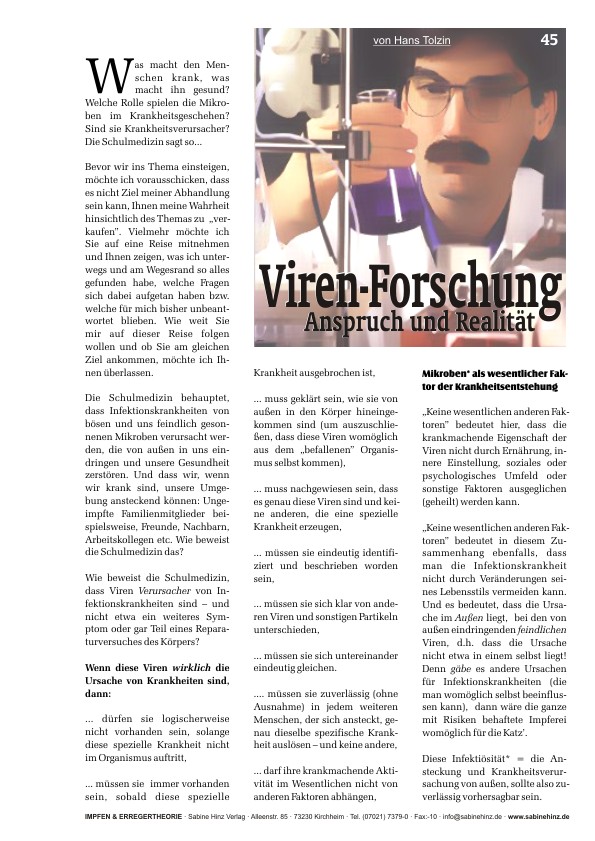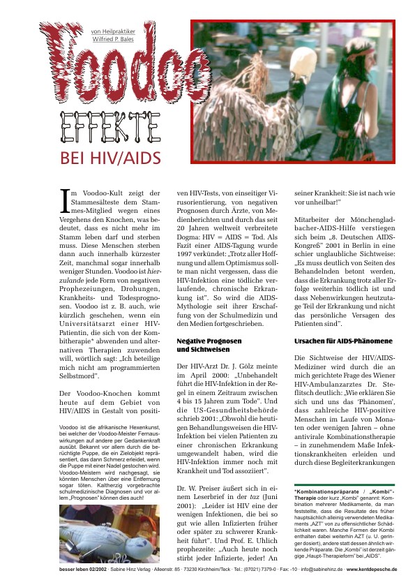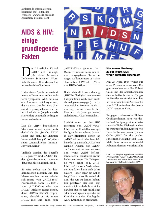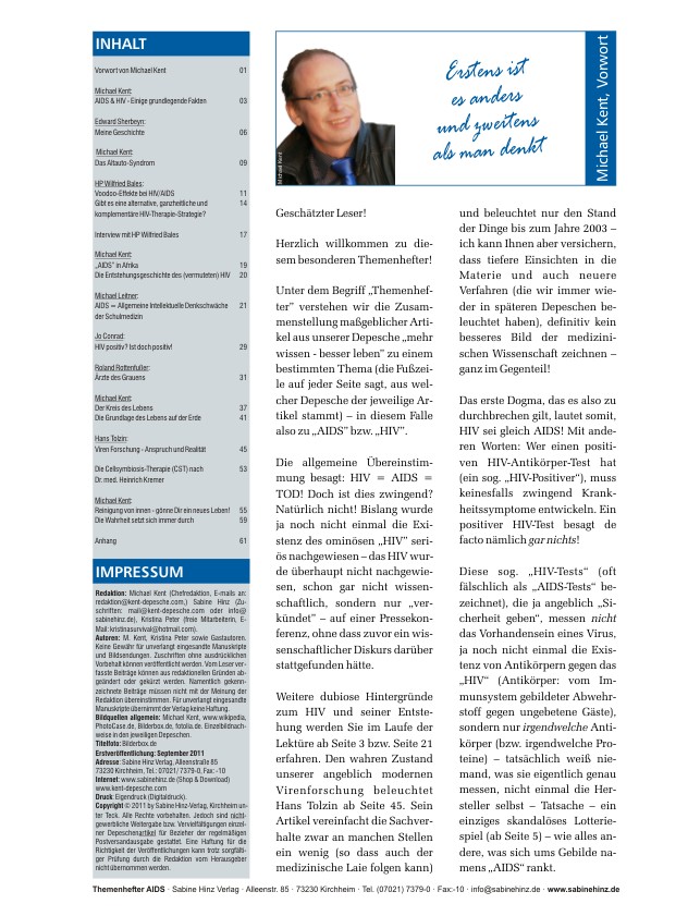 So erklärt dieses Themenheft ohne Fachlatein, was hinsichtlich „AIDS“ und „HIV“ wirklich Sache ist und vermittelt entscheidende Hinweise zur Entdeckung der wahren Ursachen jener körperlichen Symptome, die heute noch unsinnigerweise unter dem Etikett „AIDS“ zusammengefasst werden.