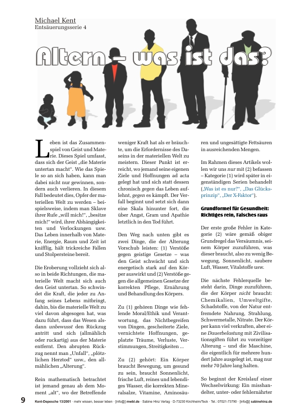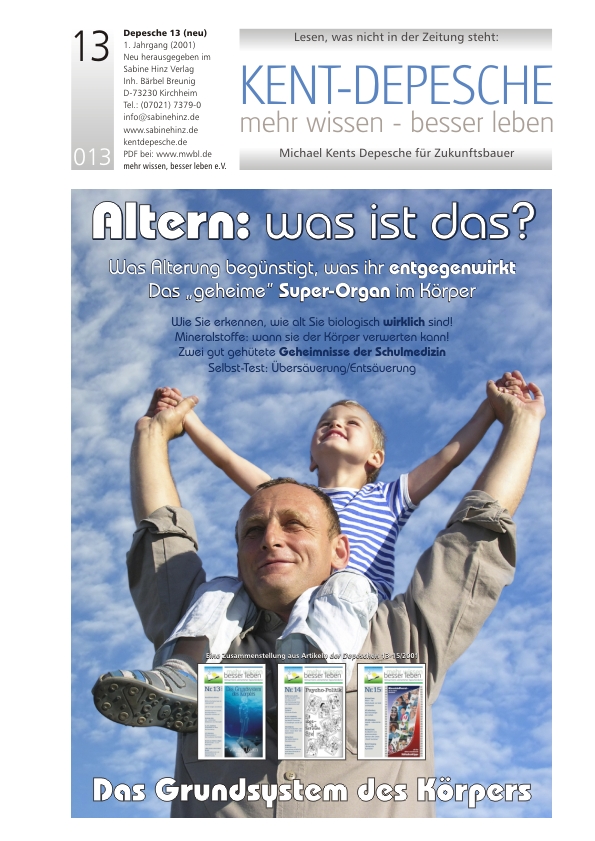 • Die Grundformel für Gesundheit. • Was ist das Altern? • Wie Sie erkennen, wie alt Sie biologisch wirklich sind! • Die Erkrankungsstufen des Menschen. • Welche Reihenfolge nimmt der körperliche Verfall – warum und wie lässt sich gegensteuern? • Mit Informationen und Lösungen zu chronischem Müdigkeitssyndrom, Heißhunger, Appetitlosigkeit, Karies, Schweißfüßen, Hautpilzen, Pickel, Akne, unreiner Haut, Haarausfall, Kopfschmerzen, Übergewicht, Verspannungen, Koliken, Krämpfe, Rheuma, Gicht, Arthrose, Arthritis, Rückenschmerzen, Bandscheiben, Kreislauferkrankungen, Nieren- und Gallensteinen, Osteoporose, Krampfadern, Herzinfarkt, Schlaganfall, Thrombose, Hämorrhoiden, Alzheimer, Parkinson, grauer Star, grüner Star, offenen Beinen, Tinnitus und Gehörsturz.