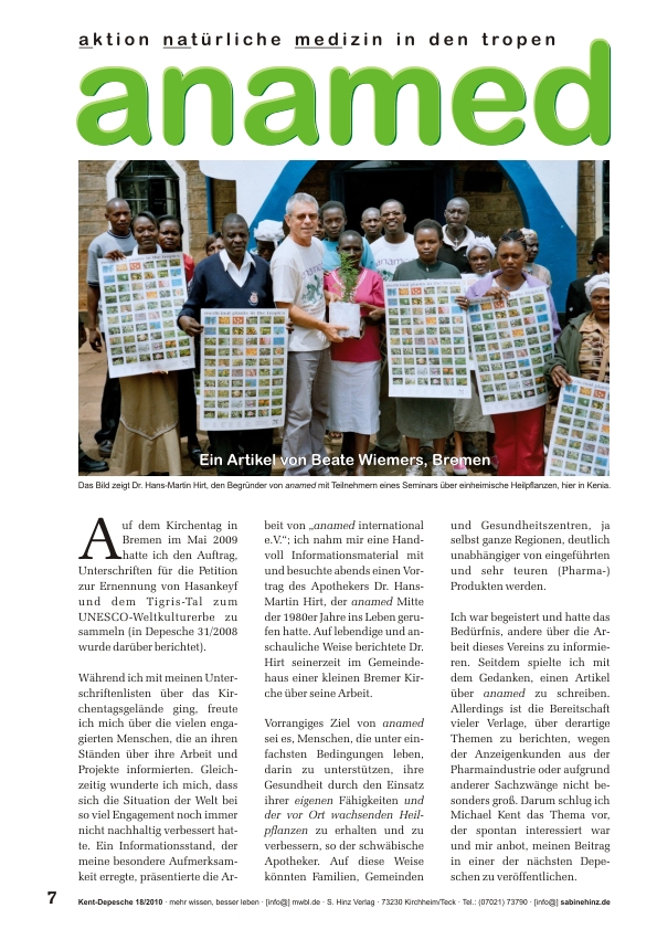 Dr. Hirt und seiner „anamed“: Aktion natürliche Medizin für Afrika und die Tropen. Heilung bei Malaria, Immunschwäche u.a. Krankheiten durch heimische Heilpflanzen. Vorrangiges anamed-Ziel ist es, Menschen, die unter einfachsten Bedingungen leben, darin zu unterstützen, ihre Gesundheit durch den Einsatz eigener Fähigkeiten und der vor Ort wachsenden Heilpflanzen zu erhalten und zu verbessern – unabhängig von Pharmaprodukten.