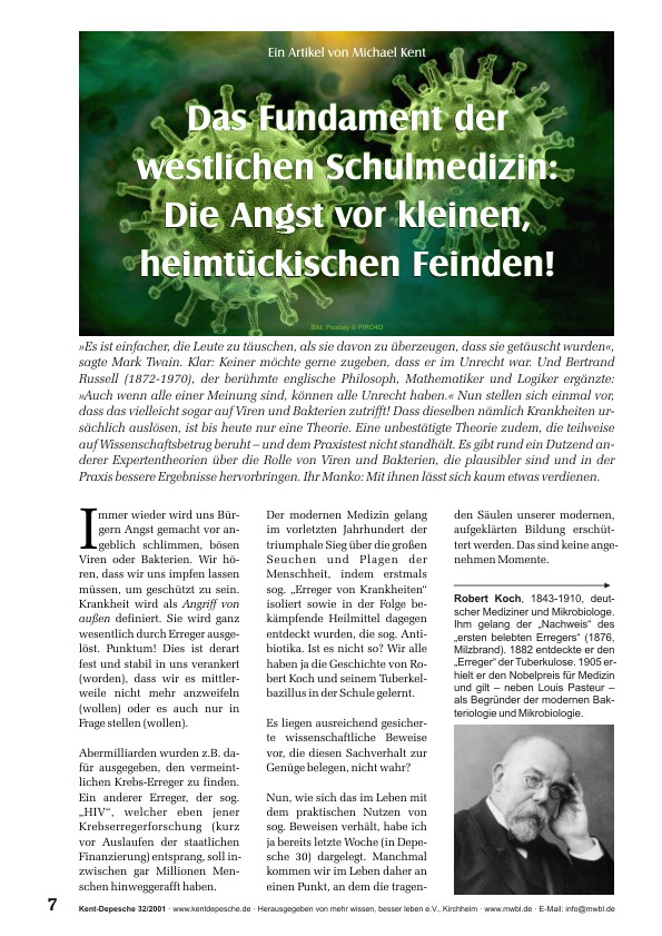 »Es ist einfacher, die Leute zu täuschen, als sie davon zu überzeugen, dass sie getäuscht wurden«, sagte Mark Twain. Klar: Keiner möchte gerne zugeben, dass er im Unrecht war. Und Bertrand Russell, der berühmte englische Philosoph, Mathematiker und Logiker ergänzte: »Auch wenn alle einer Meinung sind, können alle unrecht haben.« Können Sie sich vorstellen, dass dies sogar auf Viren und Bakterien zutrifft? Dass dieselben nämlich Krankheiten ursächlich auslösen, ist bis heute nur eine Theorie. Eine unbestätigte Theorie zudem, die teilweise auf Wissenschaftsbetrug beruht – und dem Praxistest nicht standhält. Es gibt rund ein Dutzend anderer Expertentheorien über die Rolle von Viren und Bakterien, die plausibler sind und in der Praxis bessere Ergebnisse hervorbringen. Ihr Manko: Mit ihnen lässt sich kaum etwas verdienen.