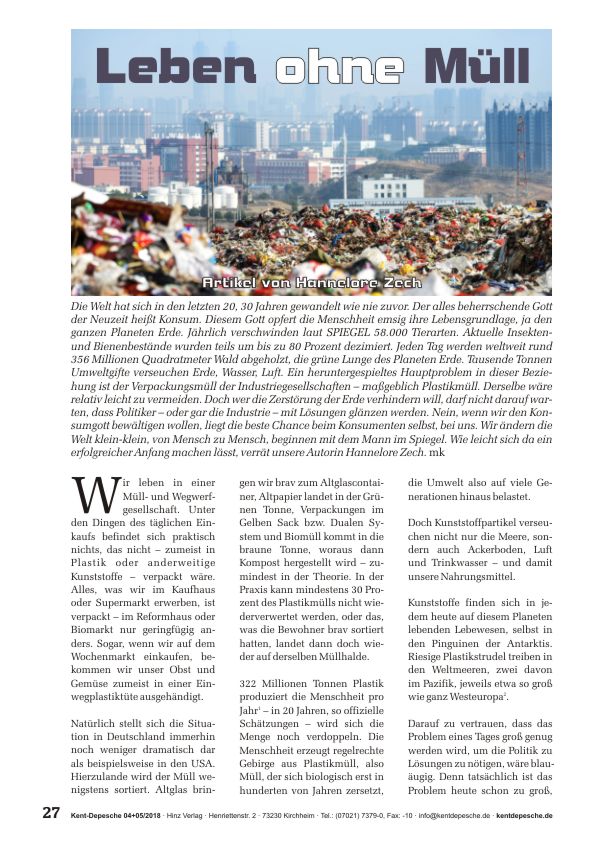 Dem Gott namens Konsum opfert die Menschheit ihre Lebensgrundlage. Ein Hauptproblem in dieser Beziehung ist der Verpackungsmüll der Industriegesellschaften – maßgeblich Plastikmüll. Derselbe wäre relativ leicht zu vermeiden. Wenn wir den „Konsumgott“ bewältigen wollen, liegt die beste Chance beim Konsumenten selbst, bei uns. Wir ändern die Welt klein-klein, von Mensch zu Mensch, beginnen mit dem Mann im Spiegel. Wie leicht sich da ein erfolgreicher Anfang machen lässt, verrät unsere Autorin Hannelore Zech.