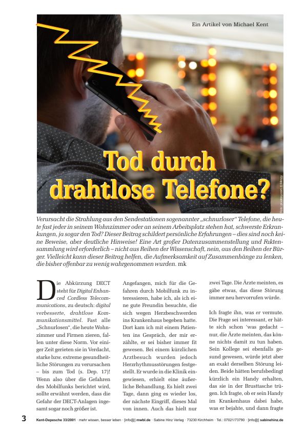 Verursacht die Strahlung aus den Sendestationen sogenannter „schnurloser“ Telefone, die heute fast jeder in seinem Wohnzimmer oder an seinem Arbeitsplatz stehen hat, Gesundheitsschäden, schwerste Erkrankungen, ja sogar den Tod? Dieser Beitrag schildert persönliche Erfahrungen – das sind keine Beweise, aber deutliche Hinweise! Eine Art großer Datenzusammenstellung und Faktensammlung wird erforderlich – nicht aus Reihen der Wissenschaft, nein, aus den Reihen der Bürger. Vielleicht kann dieser Beitrag helfen, die Aufmerksamkeit auf Zusammenhänge zu lenken, die bisher offenbar zu wenig wahrgenommen wurden.