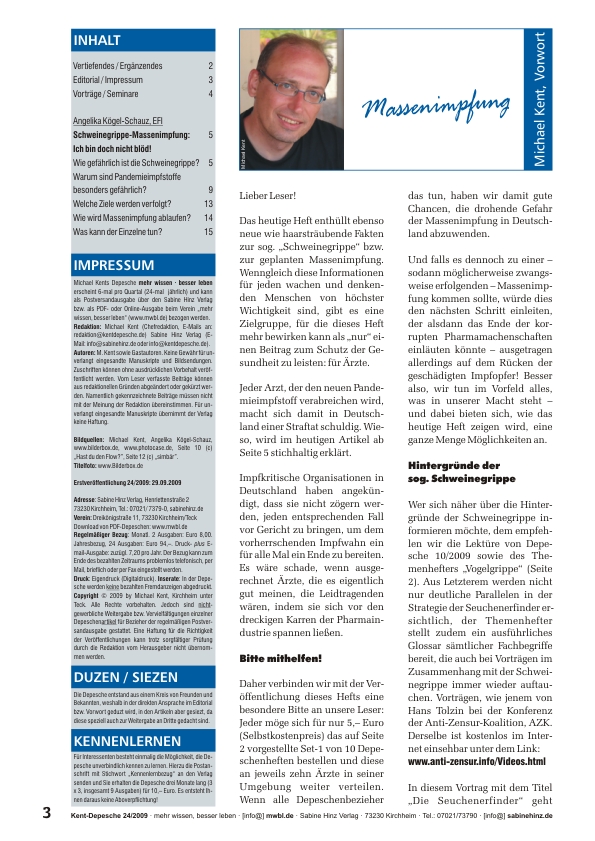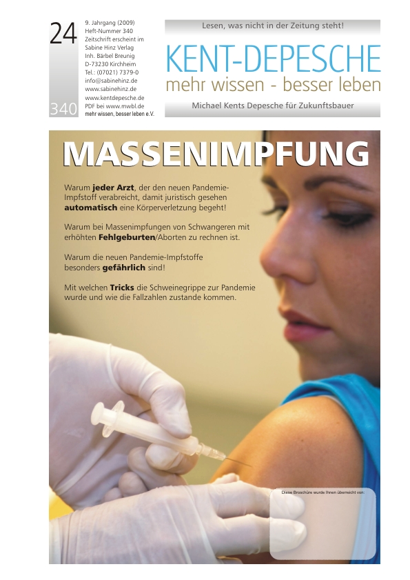 »Wo soll man bei dieser künstlich herbeigeführten Pandemie (weltweite Verbreitung einer an-steckenden Krankheit) und den demnächst drohenden Massenimpfungen mit der Aufklärung beginnen? Bei der eigentlichen Harmlosigkeit der Erkrankung? Bei den fehlerhaften Nachweisverfahren? Bei den schweren Nebenwirkungen und den zu erwartenden Todesfällen nach den Schweinegrippe-Impfungen? Bei dem Verbrechen, dass bevorzugt Schwangere, Kinder und Kranke geimpft werden? Bei den Hintergründen und Zielen der Hersteller? Bei den Beweggründen der Verantwortlichen? Bei den Verschwörungstheorien und falschen Ratschlägen von selbst ernannten Aufklärern? Jeder, der sich ernsthaft mit diesem Thema auseinandersetzt, erkennt schnell dieses Fass ohne Boden. Deshalb sollen auf den folgenden Seiten die wichtigsten Aspekte sorgfältig und klar erklärt werden.«