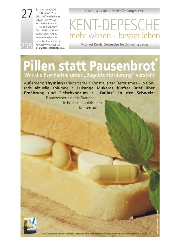 »Die Zahl der Zwangseinweisungen in eine Psychiatrie war in Deutschland noch nie so hoch wie heute – vor allem in Bayern und Niedersachsen. Bei der Kommission für Verstöße der Psychiatrie gegen Menschenrechte Deutschland e.V., (KVPM) gehen zahllose Beschwerden von Eltern ein, denen die Kinder weggenommen wurden, nachdem ein Psychiater ein willkürliches Gutachten erstellt hatte. Unzählige Familien wurden durch psychiatrische Diagnosen zerstört. Sie sind in den offiziellen Diagnosebüchern der Psychiatrie zu finden, dem ICD-10 (International Classification of Diseases) bzw. dem DSM-IV (Diagnostisches und Statistisches Manual Psychischer Störungen). Diese Bücher werden wie „Fachbücher“ verkauft, obwohl sie keinerlei wissenschaftliche Grundlage aufweisen. Die kanadische Psychologin Tana Dineen sagt: „Anders als medizinische Diagnosen, die eine mögliche Ursache, eine Prognose und eine angemessene Behandlung beinhalten, sind die im DSM-IV (und ICD-10) aufgeführten Störungen Begriffe, die durch reinen Mehrheitsbeschluss festgelegt wurden.“ Psychiater stimmen auf Konferenzen darüber ab, welche neuen „Störungen“ sie in den Katalog aufnehmen. Neue psychische Störungen bedeuteten neue Möglichkeiten, um Rechnungen zu stellen. Daher sind diese psychiatrischen Diagnosebücher mittlerweile bei renommierten Ärzten und Wissenschaftlern international in Verruf geraten. Trotzdem werden sie im psychiatrischen System weiterhin verwendet. Eine Studie von Lisa Cosgrove und Professor Sheldom Krimsky vom Frühjahr 2006 zeigt, dass zwischen 1989 und 2004 tatsächlich 100 % derjenigen, die mitbestimmen, welche neuen psychischen Störungen in den DSM-Katalog aufgenommen werden, finanziell mit der Pharmaindustrie verflochten waren. Die Rechnung geht auf: Je mehr erfundene „psychische Diagnosen“ aufgenommen werden, desto höher der Umsatz bei Psychiatrie und Pharmaindustrie. Welcher „Kollateralschaden” – in Form tragischer Einzelschicksale – im Kielwasser der gewissenlosen Psychogeschäftemacherei schwimmt, zeigt der nachfolgende Artikel.«