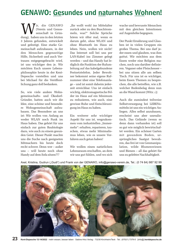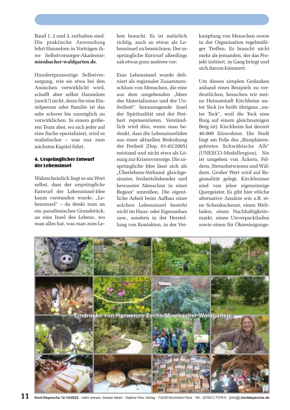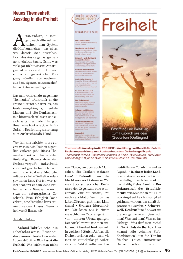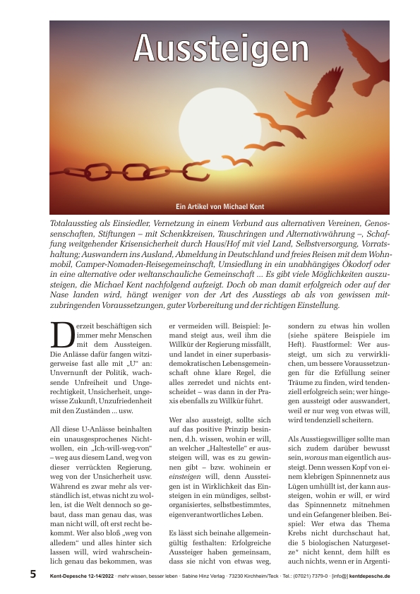 »Totalausstieg als Einsiedler, Vernetzung in einem Verbund aus alternativen Vereinen, Genossenschaften, Stiftungen – mit Schenkkreisen, Tauschringen und Alternativwährung –, Schaffung weitgehender Krisensicherheit durch Haus/Hof mit viel Land, Selbstversorgung, Vorratshaltung; Auswandern ins Ausland, Abmeldung in Deutschland und freies Reisen mit dem Wohnmobil, Camper-Nomaden-Reisegemeinschaft, Umsiedlung in ein unabhängiges Ökodorf oder in eine alternative oder weltanschauliche Gemeinschaft ... Es gibt viele Möglichkeiten auszusteigen, die Michael Kent nachfolgend aufzeigt. Doch ob man damit erfolgreich oder auf der Nase landen wird, hängt weniger von der Art des Ausstiegs ab als von gewissen mit-zubringenden Voraussetzungen, guter Vorbereitung und der richtigen Einstellung.«