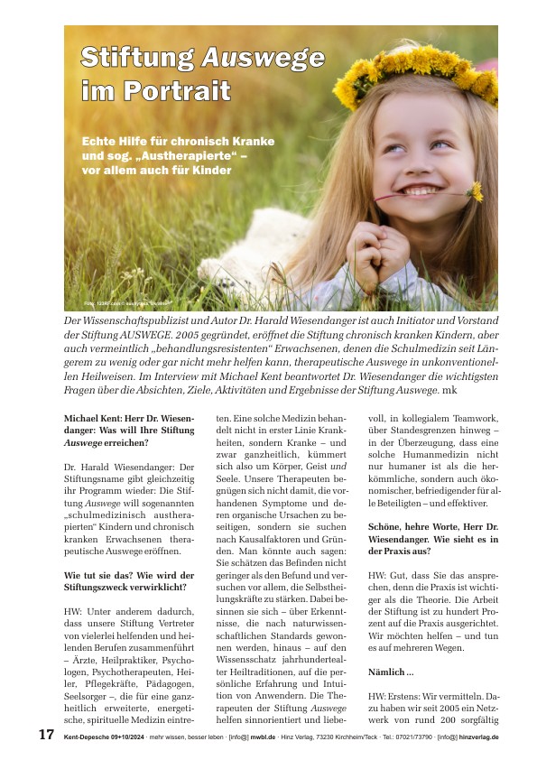 Michael Kent, InterviewStiftung Auswege im PortraitEchte Hilfe für chronisch Kranke und „Austherapierte“ – vor allem Kinder »Der Wissenschaftspublizist und Autor Dr. Harald Wiesendanger ist auch Initiator und Vorstand der Stiftung AUSWEGE. 2005 gegründet, eröffnet die Stiftung chronisch kranken Kindern, aber auch vermeintlich „behandlungsresistenten“ Erwachsenen, denen die Schulmedizin seit Längerem zu wenig oder gar nicht mehr helfen kann, therapeutische Auswege in unkonventionellen Heilweisen. Im Interview mit Michael Kent beantwortet Dr. Wiesendanger die wichtigsten Fragen über die Absichten, Ziele, Aktivitäten und Ergebnisse der Stiftung Auswege.«
