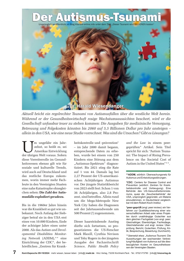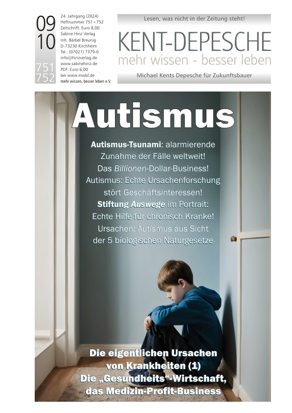 »Aktuell bricht ein regelrechter Tsunami von Autismus-Fällen über die westliche Welt herein. Während er der Gesundheitswirtschaft rosige Wachstumsaussichten beschert, wird er die Gesellschaft unfassbar teuer zu stehen kommen: Die Ausgaben für medizinische Versorgung, Betreuung und Folgekosten könnten bis 2060 auf 5,5 Billionen Dollar pro Jahr ansteigen – allein in den USA, wie eine neue Studie vorrechnet. Was sind die Ursachen? Gibt es Lösungen?«