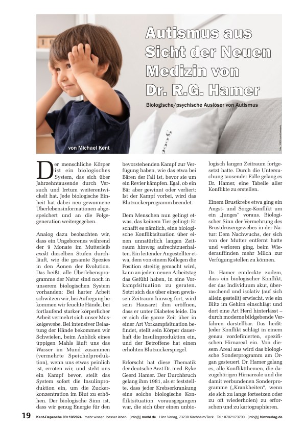 »Die Ursachen des Autismus aus Sicht der Neuen Medizin von Dr. Hamer und seiner 5 biologischen Naturgesetze lassen die die erschreckende Zunahme der Autismus-Fälle noch einmal in einem ganz anderen, völlig neuen Licht erscheinen.«