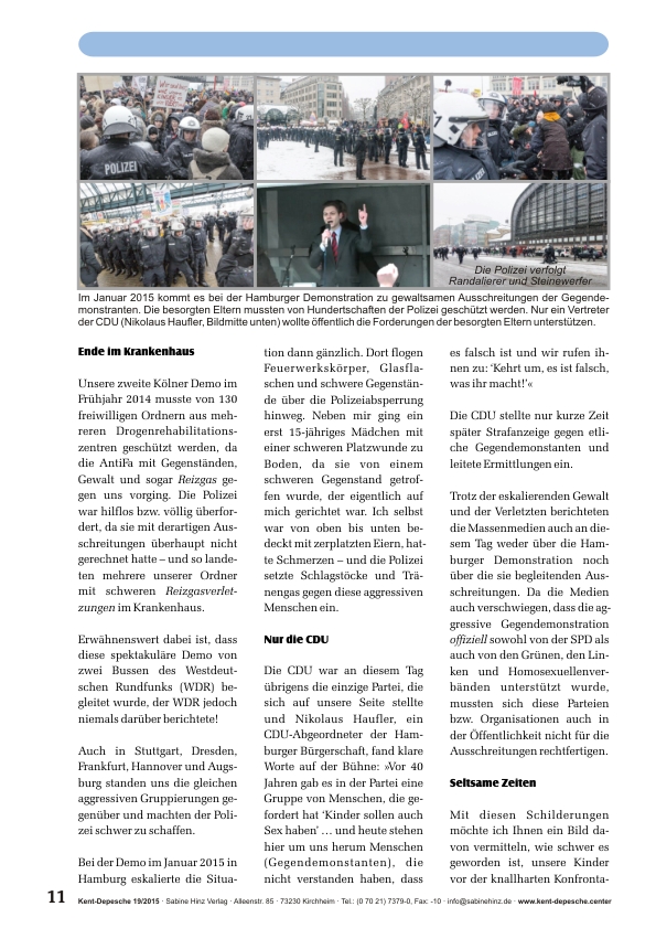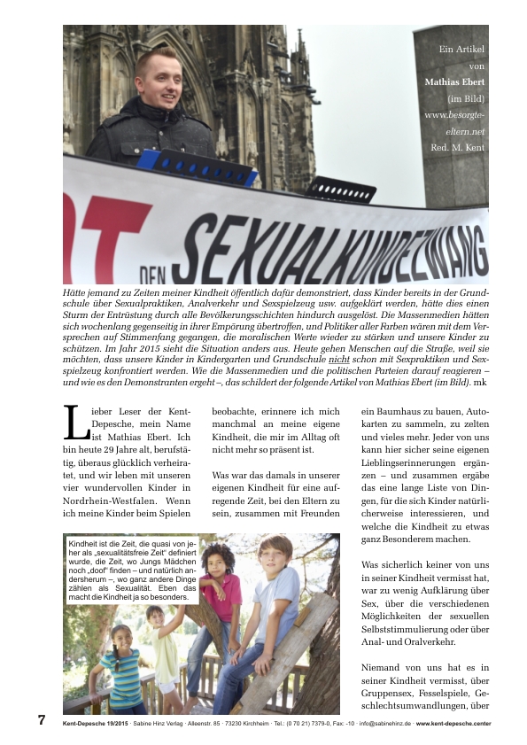 »Hätte jemand zu Zeiten meiner Kindheit öffentlich dafür demonstriert, dass Kinder bereits in der Grundschule über Sexualpraktiken, Analverkehr und Sexspielzeug usw. aufgeklärt werden, hätte dies einen Sturm der Entrüstung durch alle Bevölkerungsschichten hindurch ausgelöst. Die Massenmedien hätten sich wochenlang gegenseitig in ihrer Empörung übertroffen, und Politiker aller Farben wären mit dem Versprechen auf Stimmenfang gegangen, die moralischen Werte wieder zu stärken und unsere Kinder zu schützen. Im Jahr 2015 sieht die Situation anders aus. Heute gehen Menschen auf die Straße, weil sie möchten, dass unsere Kinder in Kindergarten und Grundschule nicht schon mit Sexpraktiken und Sexspielzeug konfrontiert werden. Wie die Massenmedien und die politischen Parteien darauf reagieren – und wie es den Demonstranten ergeht –, das schildert der folgende Artikel von Mathias Ebert.«
