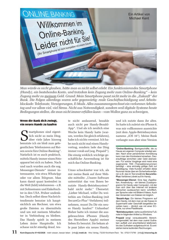 Man würde es nicht glauben, hätte man es nicht selbst erlebt: Ein funktionierendes Smartphone (Handy), ein bestehendes Konto, und trotzdem kein Zugang mehr zum Online-Banking – kein Zugang mehr zu meinem Geld. Grund: Mein Smartphone passt nicht mehr in die „Zukunft“ der Bank. Die Folgen allerdings waren sehr gegenwärtig: reale Geschäftsschädigung: Telefonate, Verzögerungen, E-Mails. Viel verlorene Zeit und vor allem Stress. Nicht aus Notwendigkeit, sondern weil digitale Systeme heute Bedingungen stellen, die man nicht immer erfüllen kann – vom Wollen ganz zu schweigen.