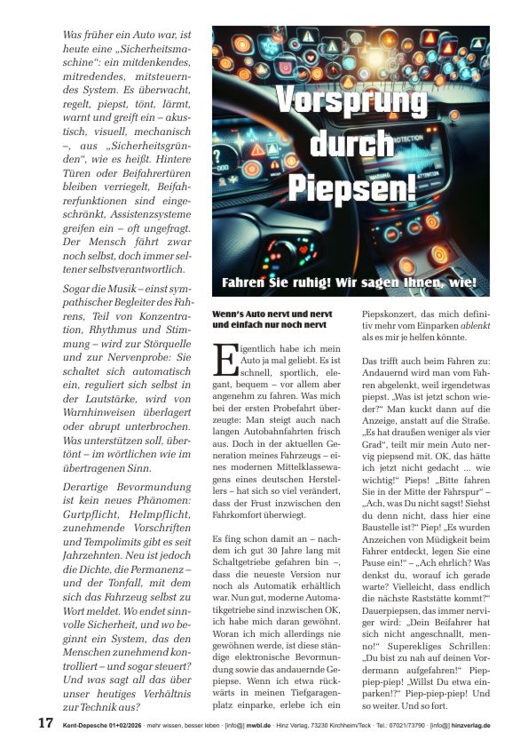 Was früher ein Auto war, ist heute eine „Sicherheitsmaschine“: ein mitredendes, mitsteuerndes System. Es überwacht, piepst, warnt und greift ein – akustisch, visuell, mechanisch –, aus „Sicherheitsgründen“ – oft ungefragt. Sogar die Musik wird zur Störquelle und zur Nervenprobe: Sie schaltet sich automatisch ein, reguliert sich selbst in der Lautstärke, wird von Warnhinweisen überlagert oder abrupt unterbrochen. Derartige Bevormundung ist kein neues Phänomen. Neu jedoch sind die Dichte, die Permanenz und der Tonfall, mit dem sich das Fahrzeug selbst zu Wort meldet. Wo endet sinnvolle Sicherheit, und wo beginnt ein System, das den Menschen zunehmend kontrolliert – und sogar steuert?