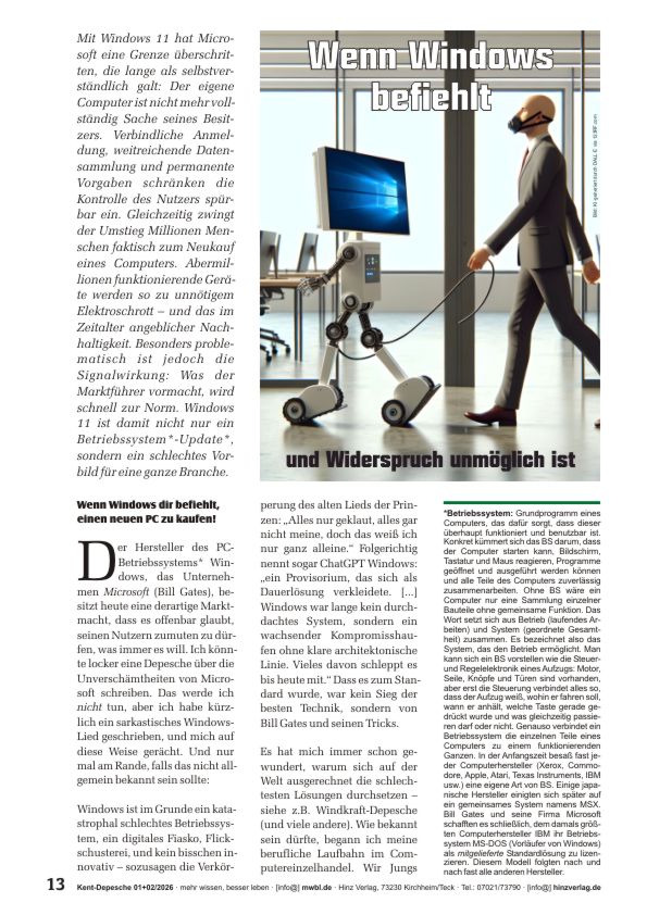 Mit Windows 11 hat Microsoft eine Grenze überschritten, die lange als selbstverständlich galt: Der eigene Computer ist nicht mehr Sache seines Besitzers. Verbindliche Anmeldung, weitreichende Datensammlung und permanente Vorgaben schränken die Kontrolle spürbar ein. Gleichzeitig zwingt der Umstieg Millionen Menschen faktisch zum Neukauf eines Computers. Abermillionen funktionierende Geräte werden so zu Elektroschrott – und das im Zeitalter angeblicher Nachhaltigkeit. Besonders problematisch ist jedoch die