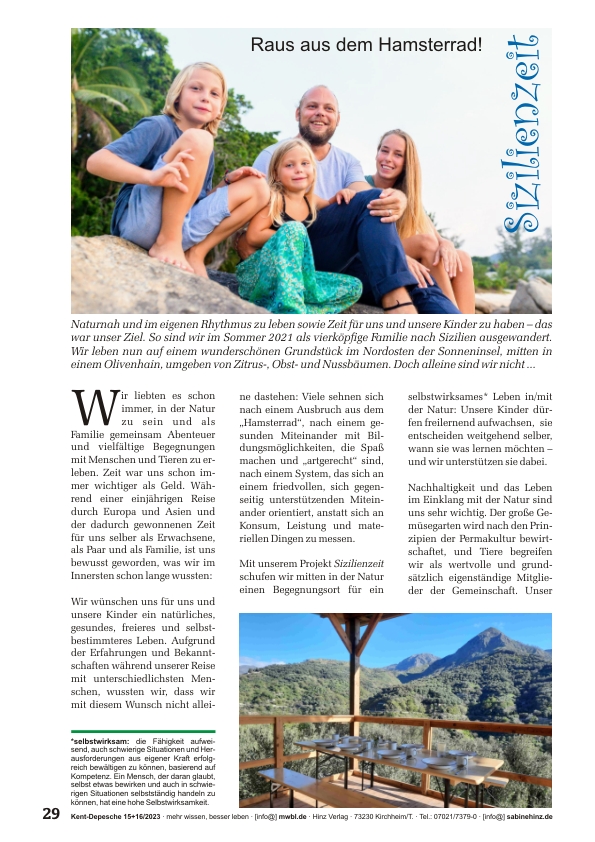 »Naturnah und im eigenen Rhythmus zu leben sowie Zeit für uns und unsere Kinder zu haben – das war unser Ziel. So sind wir im Sommer 2021 als vierköpfige Familie nach Sizilien ausgewandert. Wir leben nun auf einem wunderschönen Grundstück im Nordosten der Sonneninsel, mitten in einem Olivenhain, umgeben von Zitrus-, Obst- und Nussbäumen. Doch alleine sind wir nicht ...«