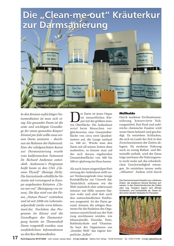»In den Kreisen aufrichtiger Naturmediziner ist man sich einig: Ein gesunder Darm ist die erste und wichtigste Grundlage für einen gesunden Körper! Einmal pro Jahr sollte man seinen Darm sanieren – durchaus im Rahmen der Fastenzeit. Eine der erfolgreichsten Kuren zur Darmsanierung wurde vom kalifornischen Naturarzt Dr. Richard Andersen entwickelt. Andersons’s Programm heißt heute in den USA „Cleanse Thyself” (Reinige Dich). Die hierzulande erhältliche Variante mit vorwiegend in Europa angebauten Kräutern „Clean-me-out” (Reinigung von innen). Die Kur wird von der Firma „Nature Power“ vertrieben. Nachdem das Programm (in Kürze) und die Grundlagen der Darmreinigung bereits im Themenheft Darm vorgestellt wurden, nun ausführlichere Informationen zu den Kur-Bestandteilen.«
