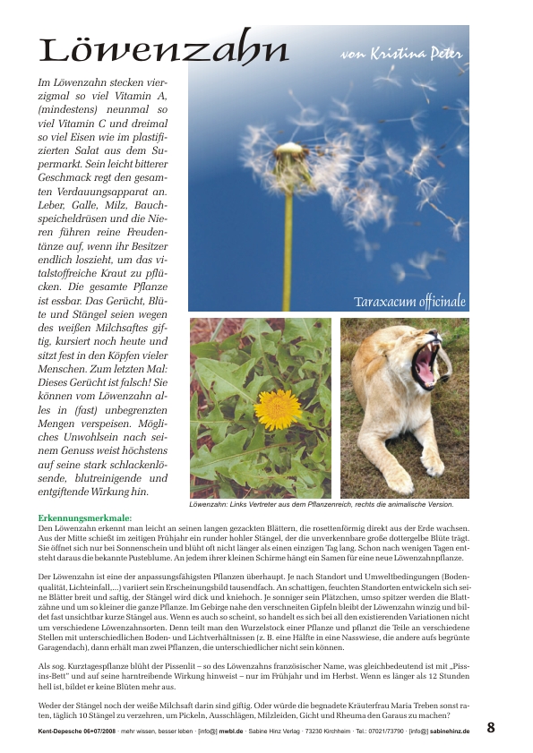 »Im Löwenzahn stecken vierzigmal so viel Vitamin A, (mindestens) neunmal so viel Vitamin C und dreimal so viel Eisen wie im plastifizierten Salat aus dem Supermarkt. Sein leicht bitterer Geschmack regt den gesamten Verdauungsapparat an. Leber, Galle, Milz, Bauchspeicheldrüsen und die Nieren führen reine Freudentänze auf, wenn ihr Besitzer endlich loszieht, um das vitalstoffreiche Kraut zu pflücken. Die gesamte Pflanze ist essbar. Das Gerücht, Blüte und Stängel seien wegen des weißen Milchsaftes giftig, kursiert noch heute und sitzt fest in den Köpfen vieler Menschen. Zum letzten Mal: Dieses Gerücht ist falsch! Sie können vom Löwenzahn alles in (fast) unbegrenzten Mengen verspeisen. Mögliches Unwohlsein nach seinem Genuss weist höchstens auf seine stark schlackenlösende, blutreinigende und entgiftende Wirkung hin.«