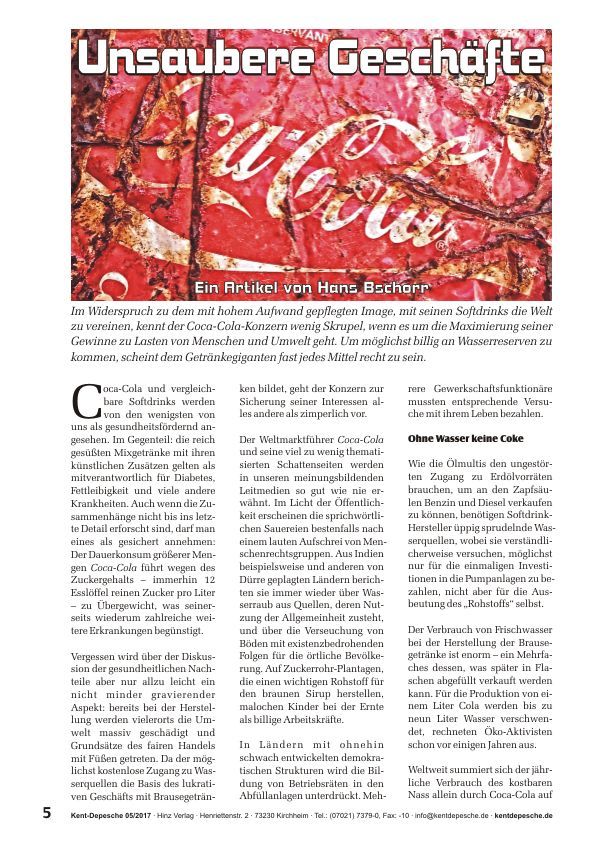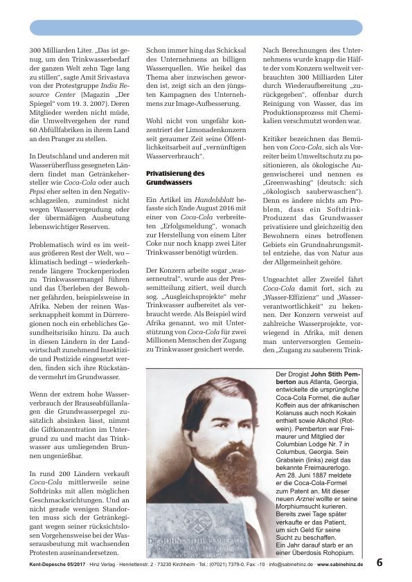 Damit sind wir schon beim Geschäftsgebahren des Limonadengiganten aus Atlanta, der offenbar keine Skrupel kennt, wenn es um seine Profite geht. Derzeit immerhin 7 Milliarden Dollar jährlich! Das Konzept ist zugegebenermaßen genial: Man nehme nahezu kostenlos erhältliches Grundwasser, versetze es mit Zucker, Säure, Koffein, Aromen – und verkaufe das Grundwasser tausendfach verteuert an die Bevölkerung zurück. Auf die Idee muss man erstmal kommen. ;-) Im Widerspruch zu dem mit hohem Aufwand gepflegten Image, mit seinen Softdrinks die Welt zu vereinen, kennt der Coca-Cola-Konzern wenig Skrupel, wenn es um die Maximierung seiner Gewinne zu Lasten von Menschen und Umwelt geht. Um möglichst billig an Wasserreserven zu kommen, scheint dem Getränkegiganten fast jedes Mittel recht zu sein ...