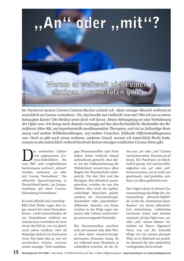 Im Nachwort meines Corona-Cartoon-Buches schrieb ich: »Kein einziger Mensch weltweit ist ursächlich an Corona verstorben«. Ich bezog mich damals vorrangig auf das durchschnittliche Sterbealter der Betroffenen (über 80), auf experimentelle medikamentöse Therapien, auf viel zu frühzeitige Beatmung und andere Fehlbehandlungen, auf andere Ursachen, fehlende Differentialdiagnosen