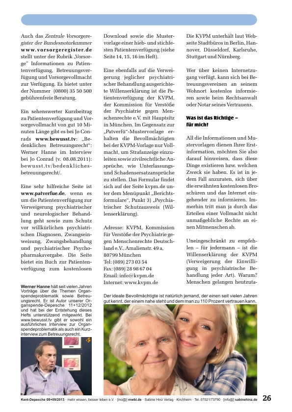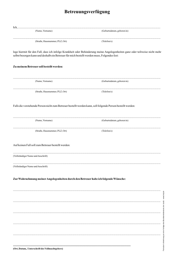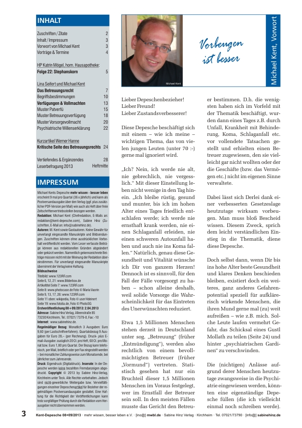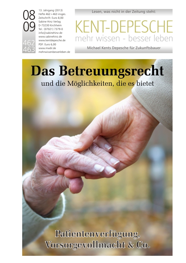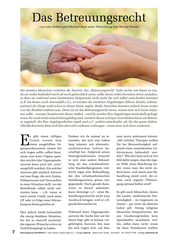 »Die meisten Menschen vertreten die Ansicht, das Betreuungsrecht habe nichts mit ihnen zu tun, da sie weder behindert noch alt noch gebrechlich seien; sollte ihnen wider Erwarten etwas zustoßen, so dass sie während einer bestimmten Zeitperiode nicht mehr für sich selbst entscheiden könnten (z.B. bei Koma nach Autounfall o.Ä.), so würden die nächsten Angehörigen (Eltern, Kinder, Lebenspartner) die Dinge wohl schon in ihrem Sinne regeln. Beide Ansichten könnten jedoch kaum weiter von der Realität entfernt sein. Denn (a) ist das Betreuungsrecht etwas, womit man sich heute befassen sollte – warum, beantwortet dieser Artikel – und (b) werden Ihre Angehörigen keinesfalls gefragt, wenn Sie nicht mehr entscheidungsfähig sind, sondern Ihnen wird per Gerichtsbeschluss ein Betreuer zugeteilt, der Ihre Angelegenheiten regelt und u.U. anders entscheidet, als Sie das gerne hätten. Glücklicherweise lässt sich hier aber sehr wirksam vorbeugen – wenn man sich denn auskennt ...«