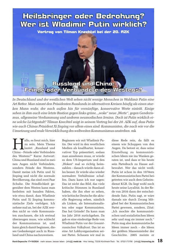 In alternativen Kreisen nimmt man den Präsidenten Russlands häufig als einen starken Mann wahr, der nach außen hin für vernünftige, konservative Werte eintritt. Einige sehen in ihm auch eine letzte Bastion gegen links-grüne, „woke“ neue „Werte“, gegen Genderismus ... Doch ist Putin wirklich eine Lichtgestalt? Tilman Knechtel zeigt in seinem Vortrag bei der 20. AZK auf, dass Putin wie auch Chinas Präsident Xi Jinping vor allem eines sind: Kommunisten, die nach wie vor die Umsetzung und reale Verwirklichung des weltweiten Kommunismus anstreben.