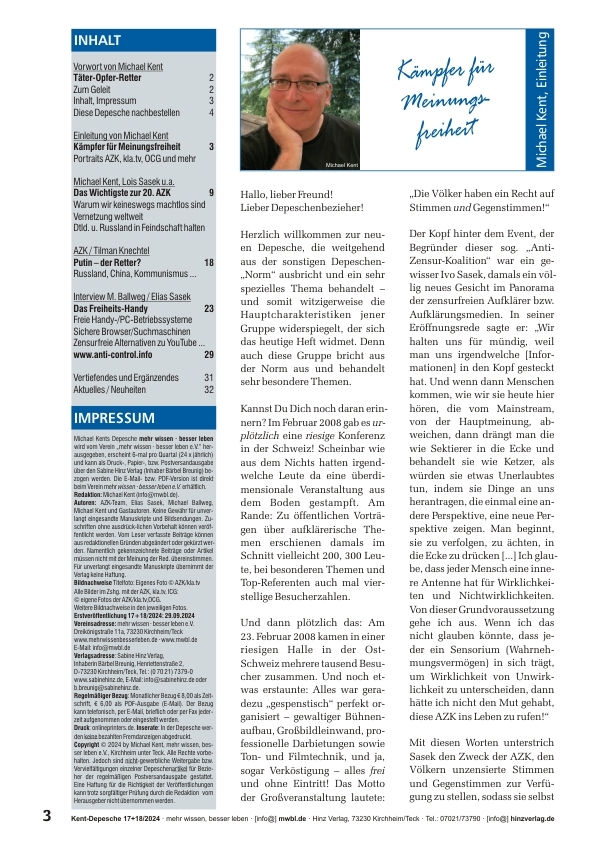 2008 fand die erste Anti-Zensur-Koalition statt. Heute, 2024, gehört die AZK zu den größten Plattformen Europas für freie Aufklärung. Sie begegnet der fortschreitenden Zensur mit Gegenstimmen und gab in den 16 Jahren ihres Bestehens 85 Referenten eine Plattform für unzensierte Redefreiheit.