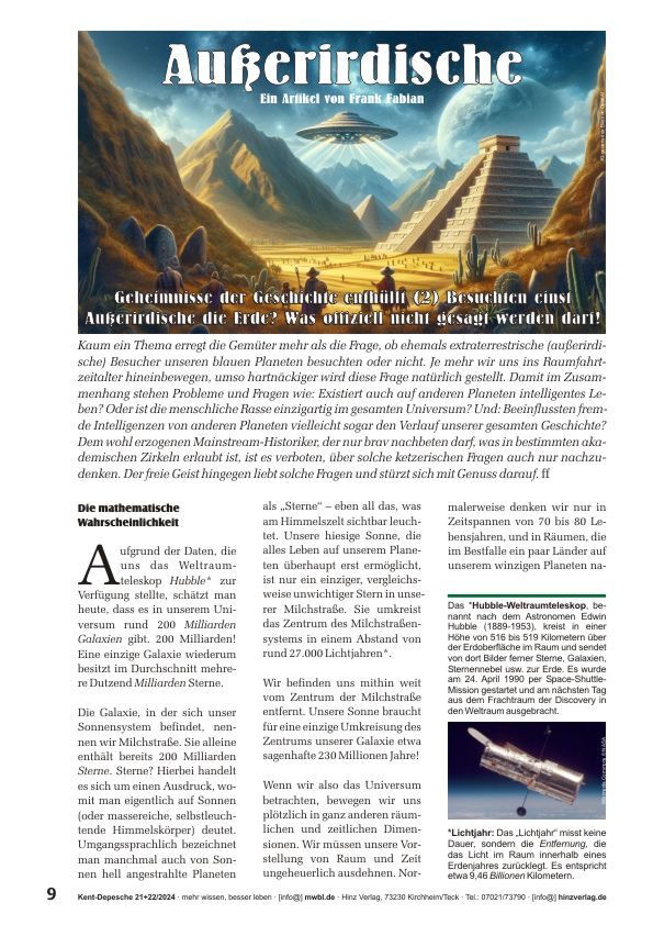 »Kaum ein Thema erregt die Gemüter mehr als die Frage, ob ehemals extraterrestrische Besucher unseren blauen Planeten besuchten oder nicht. Je mehr wir uns ins Raumfahrtzeitalter hineinbewegen, umso hartnäckiger wird diese Frage natürlich gestellt. Damit im Zusammenhang stehen Probleme und Fragen wie: Existiert auch auf anderen Planeten intelligentes Leben? Oder ist die menschliche Rasse einzigartig im gesamten Universum? Und: Beeinflussten fremde Intelligenzen von anderen Planeten vielleicht sogar den Verlauf unserer gesamten Geschichte? Dem wohl erzogenen Mainstream-Historiker, der nur brav nachbeten darf, was in bestimmten akademischen Zirkeln erlaubt ist, ist es verboten, über solche ketzerischen Fragen auch nur nachzudenken. Der freie Geist hingegen liebt solche Fragen und stürzt sich mit Genuss darauf.«