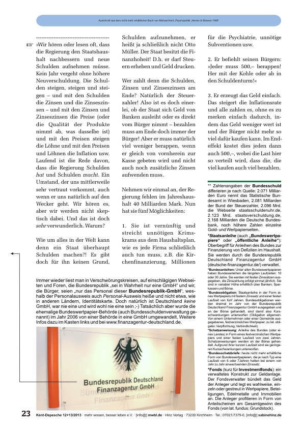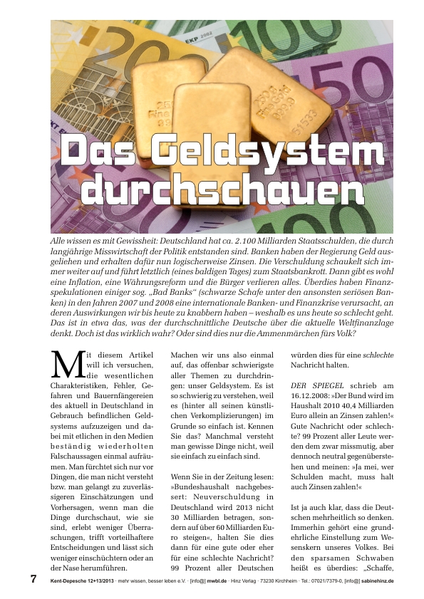 Alle wissen es: Deutschland hat ca. 2.100 Milliarden Staatsschulden, die durch Misswirtschaft der Politik entstanden sind. Banken haben der Regierung Geld ausgeliehen und erhalten dafür nun Zinsen. Die Verschuldung schaukelt sich immer weiter auf und führt letztlich zum Staatsbankrott. Dann gibt es wohl eine Inflation, eine Währungsreform und die Bürger verlieren alles. Überdies haben Finanzspekulationen einiger sog. „Bad Banks“ (schwarze Schafe unter den ansonsten seriösen Banken) in den Jahren 2007 und 2008 eine internationale Banken- und Finanzkrise verursacht, an deren Auswirkungen wir bis heute zu knabbern haben – weshalb es uns heute so schlecht geht. Das ist in etwa das, was der durchschnittliche Deutsche über die aktuelle Weltfinanzlage denkt. Doch ist das wirklich wahr? Oder sind dies nur die Ammenmärchen fürs Volk?«