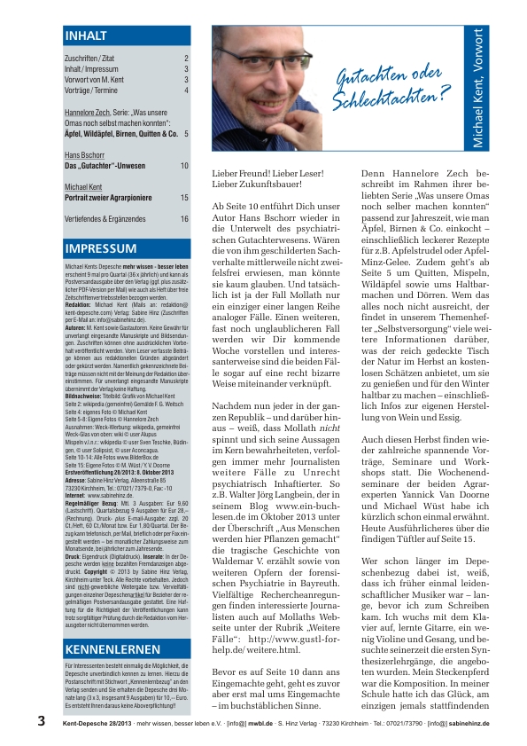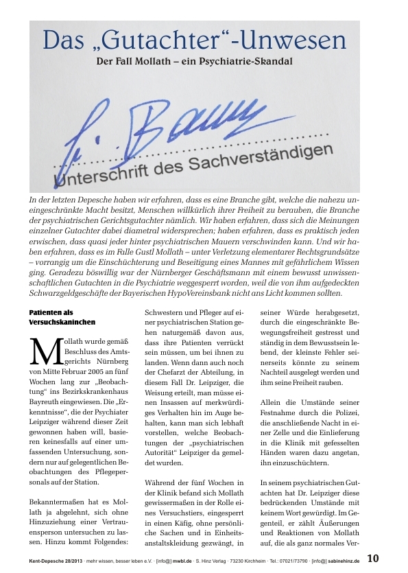 »In der letzten Depesche haben wir erfahren, dass es eine Branche gibt, welche die nahezu uneingeschränkte Macht besitzt, Menschen willkürlich ihrer Freiheit zu berauben, die Branche der psychiatrischen Gerichtsgutachter nämlich. Wir haben erfahren, dass sich die Meinungen einzelner Gutachter dabei diametral widersprechen; haben erfahren, dass es praktisch jeden erwischen, dass quasi jeder hinter psychiatrischen Mauern verschwinden kann. Und wir haben erfahren, dass es im Falle Gustl Mollath – unter Verletzung elementarer Rechtsgrundsätze – vorrangig um die Einschüchterung und Beseitigung eines Mannes mit gefährlichem Wissen ging. Geradezu böswillig war der Nürnberger Geschäftsmann mit einem bewusst unwissenschaftlichen Gutachten in die Psychiatrie weggesperrt worden, weil die von ihm aufgedeckten Schwarzgeldgeschäfte der Bayerischen HypoVereinsbank nicht ans Licht kommen sollten.«