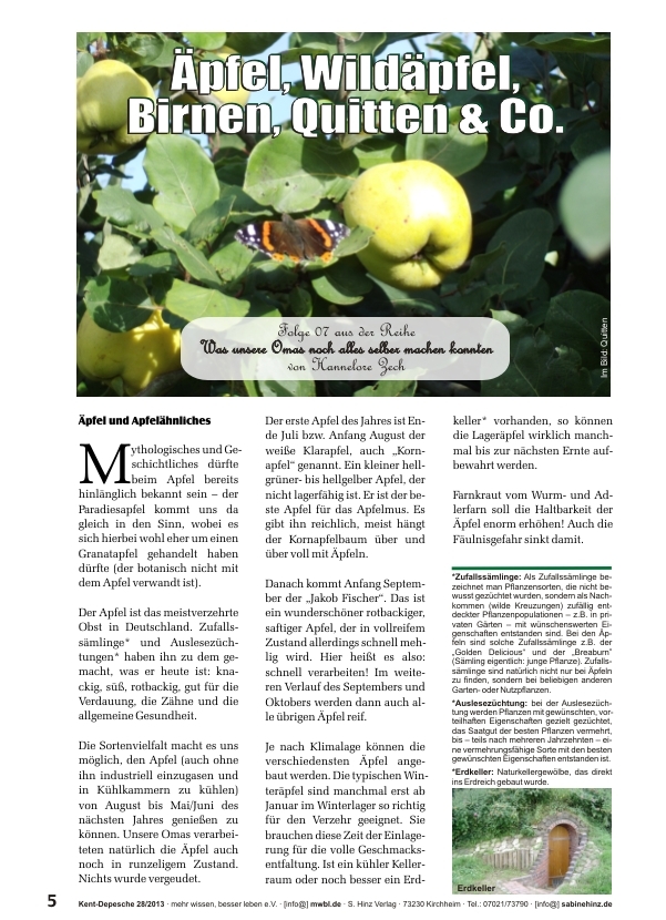 »Hannelore Zech beschreibt im Rahmen ihrer beliebten Serie „Was unsere Omas noch selber machen konnten“ passend zur Jahreszeit, wie man Äpfel, Birnen & Co. einkocht – einschließlich leckerer Rezepte für z.B. Apfelstrudel oder Apfel-Minz-Gelee. Zudem geht’s ab Seite 5 um Quitten, Mispeln, Wildäpfel sowie ums Haltbarmachen und Dörren.«