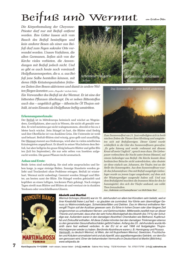 »Die Körperbemalung der Cheyenne-Priester darf nur mit Beifuß entfernt werden. Ihre Götter lassen sich vom Rauch des Beifuß besänftigen und kein anderer Besen als einer aus Beifuß darf zum Fegen sakraler Orte verwendet werden. Unsere Vorfahren, die alten Germanen, ließen sich von der Kirche vieles verbieten, die Anwendungen mit Beifuß jedoch nicht. Und so gibt es auch heute noch vereinzelt Heilpflanzenexperten, die u. a. aus Beifuß jene Salbe herstellen können, mit deren Hilfe Kräuterspezialisten früherer Zeiten ihre Besen aktivieren und damit in andere Welten fliegen konnten.Ein Verwandter des Beifuß ist der Wermut. Er ist eine der bittersten Pflanzen überhaupt. Da er neben Bitterstoffen auch das – angeblich giftige – ätherische Öl Thujon enthält, ist sein Einsatz als Heilpflanze heftig umstritten.«