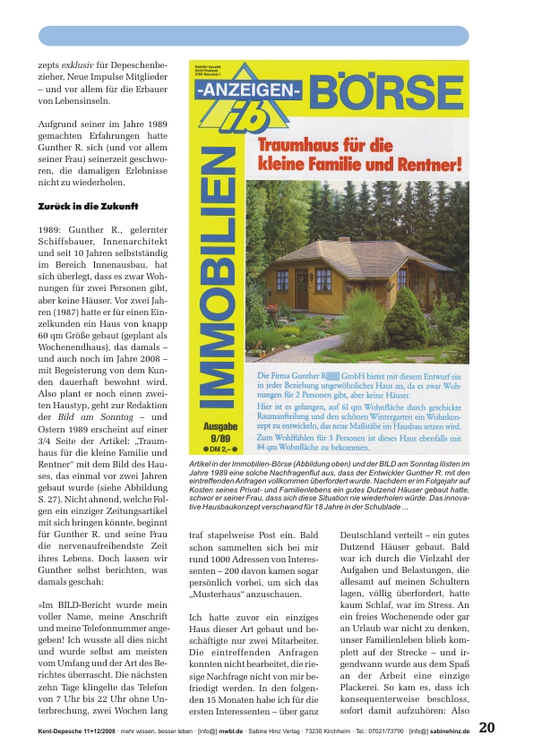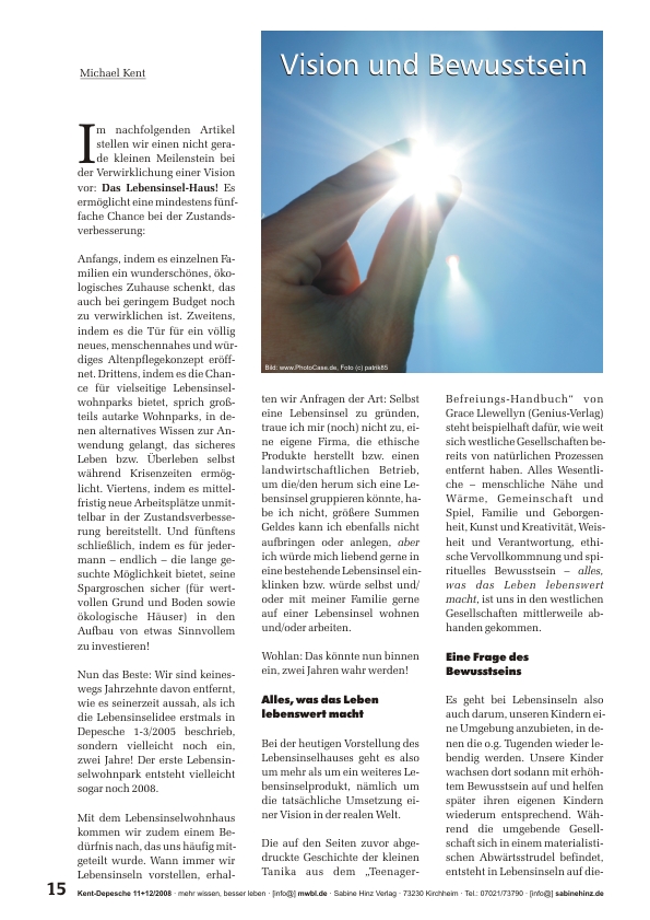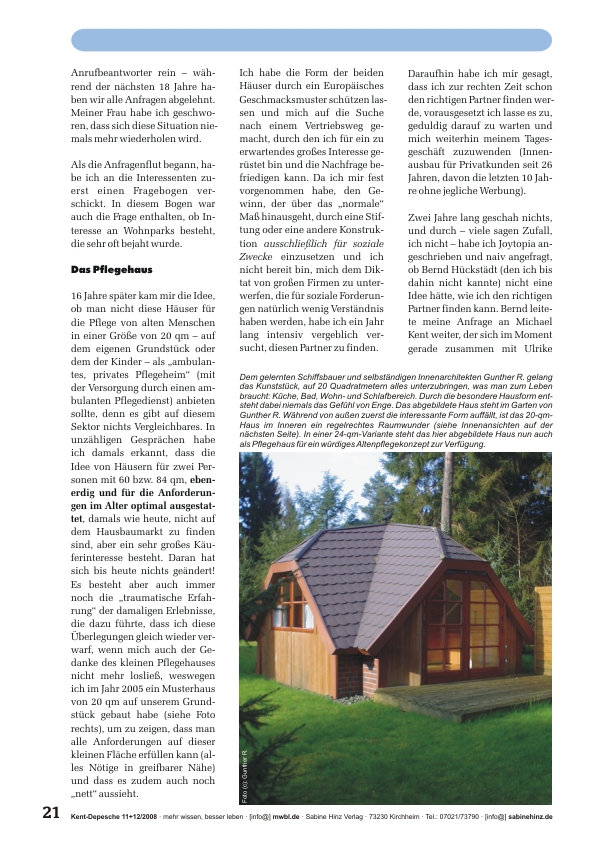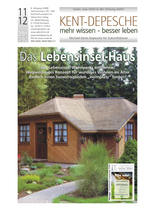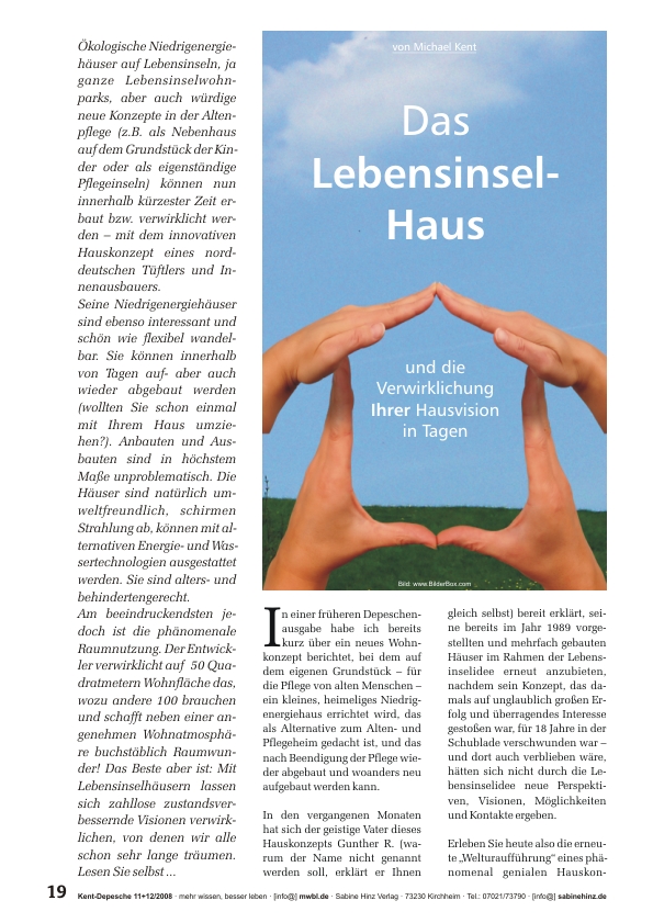 »Ökologische Niedrigenergiehäuser auf Lebensinseln, ja ganze Lebensinselwohnparks, aber auch würdige neue Konzepte in der Altenpflege (z.B. als Nebenhaus auf dem Grundstück der Kinder oder als eigenständige Pflegeinseln) können nun innerhalb kürzester Zeit erbaut bzw. verwirklicht werden – mit dem innovativen Hauskonzept eines norddeutschen Tüftlers und Innenausbauers. Seine Niedrigenergiehäuser sind ebenso interessant und schön wie flexibel wandelbar. Sie können innerhalb von Tagen auf- aber auch wieder abgebaut werden (wollten Sie schon einmal mit Ihrem Haus umziehen?). Anbauten und Ausbauten sind in höchstem Maße unproblematisch. Die Häuser sind natürlich umweltfreundlich, schirmen Strahlung ab, können mit alternativen Energie- und Wassertechnologien ausgestattet werden. Sie sind alters- und behindertengerecht. Am beeindruckendsten jedoch ist die phänomenale Raumnutzung. Der Entwickler verwirklicht auf 50 Quadratmetern Wohnfläche das, wozu andere 100 brauchen und schafft neben einer angenehmen Wohnatmosphäre buchstäblich Raumwunder! Das Beste aber ist: Mit Lebensinselhäusern lassen sich zahllose zustandsverbessernde Visionen verwirklichen, von denen wir alle schon sehr lange träumen. Lesen Sie selbst …« mk
