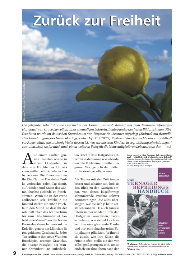 »Die folgende, sehr rührende Geschichte der kleinen „Tanika“ stammt aus dem Teenager-Befreiungs-Handbuch von Grace Llewellyn, einer ehemaligen Lehrerin, heute Pionier der freien Bildung in den USA. Das Buch wurde im deutschen Sprachraum von Dagmar Neubronner aufgelegt. Während die Geschichte uns sinnbildhaft vor Augen führt, wie unsinnig Vieles dessen ist, was wir unseren Kindern in sog. „Bildungseinrichtungen“ zumuten, stellt sie für mich auch einen weiteren Beleg für die Notwendigkeit von Lebensinseln dar.« mk
