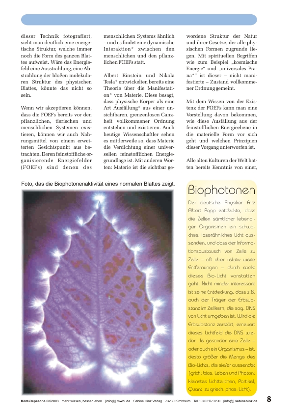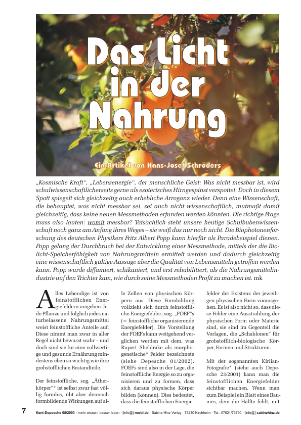 „Kosmische Kraft“, Lebensenergie, der menschliche Geist: Was nicht messbar ist, wird von Seiten der Schulwissenschaft gerne als esoterisches Hirngespinst verspottet. Doch in diesem Spott spiegelt sich erhebliche Arroganz wieder. Denn eine Wissenschaft, die behauptet, was nicht messbar sei, sei auch nicht wissenschaftlich, mutmaßt damit, dass keine neuen Messmethoden erfunden werden könnten. Die richtige Frage muss also lauten: womit messbar? Tatsächlich steht unsere heutige „Schulbubenwissenschaft“ noch ganz am Anfang ihres Weges – sie weiß das nur noch nicht. Die Biophotonenforschung des deutschen Physikers Fritz Albert Popp kann hierfür als Paradebeispiel dienen. Popp gelang der Durchbruch bei der Entwicklung einer Messmethode, mittels der die Biolicht-Speicherfähigkeit von Nahrungsmitteln ermittelt werden und dadurch gleichzeitig eine wissenschaftlich gültige Aussage über die Qualität von Lebensmitteln getroffen werden kann. Popp wurde diffamiert, schikaniert, und erst rehabilitiert, als die Nahrungsmittelindustrie auf den Trichter kam, wie durch seine Messmethoden Profit zu machen ist.
