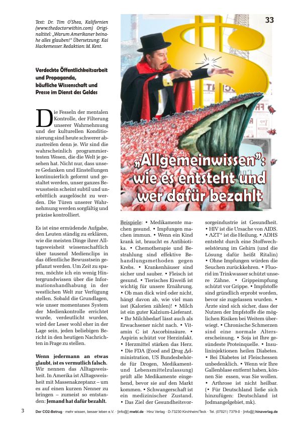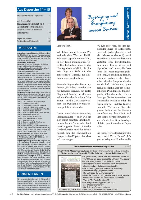 • Wie es sein kann, dass der ganzen Welt ein nicht-existentes Problem als Bedrohung des Planeten verkauft wird: Die Welt der „PR“, der sog. „Public Relations“, moderne Öffentlichkeits- und Medienarbeit im Dienste des Großkapitals.