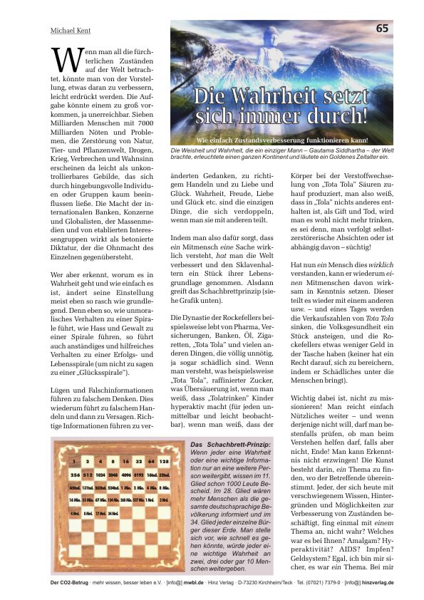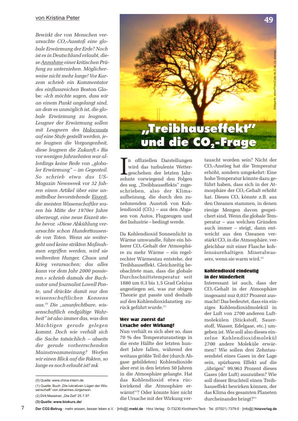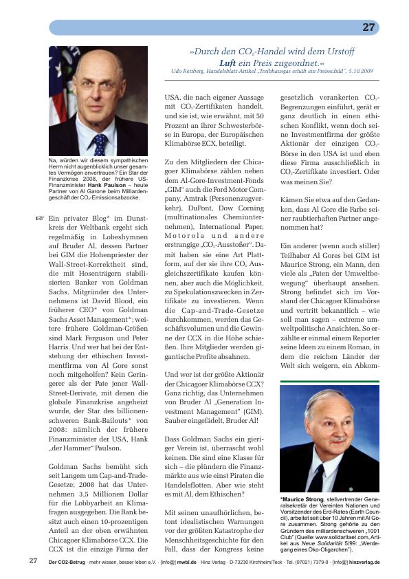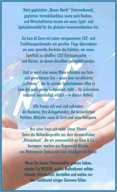 »Nach geplatztem „Neuen Markt” (Internetboom), geplatzter Immobilienblase sowie nach Banken- und Wirtschaftskrise musste ein neues Spekulationsfeld für die globalen Investmentbanken her. Da kam Al Gore mit seiner CO2- und Treibhauspanikmache wie gerufen. Flugs überredeten ein paar gewiefte Bankster die Politiker, ein neues Spielfeld zu schaffen: CO2-Emissionsrechte – und Börsen, an denen dieselben gehandelt werden. Und so ward eine neuen Blase erfunden aus farb- und geruchlosem Gas – quasi eine verschleierte „Luftsteuer”, die für private Spekulationen offen ist (wie das ganz genau funktioniert, steht – für jedermann maximal verständlich erklärt – in diesem Hefter). Alle freuen sich und sind zufrieden: die Bankster, ihre Anlagekunden, die bestechlichen Politiker, Mitläufer sowie Al Gore und seine Kumpane. Nur einer freut sich nicht: Unser Planet! Denn die Milliardenprofite aus dem vermeintlichen „Klimaschutz”, die wir unwissentlich an Gore & Co. berappen, machen aus Regenwald Wüsten, aus Weltmeeren Todeszonen und schädigen das Klima.«