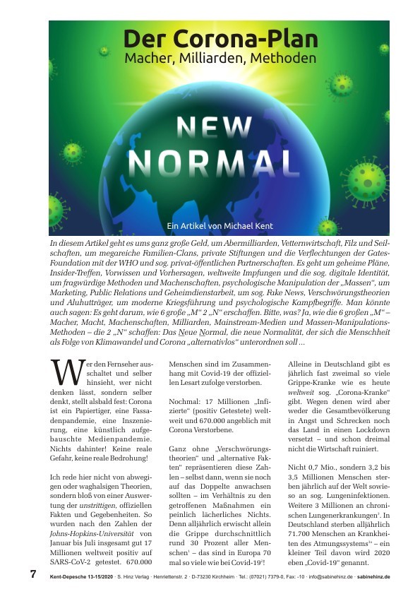 In dieser Depesche geht es ums große Geld, um megareiche Familien-Clans, private Stiftungen und die Verflechtungen von Gates mit der WHO, CEPI, Gavi, Global Fund … Es geht um geheime Pläne, Insider-Treffen, Vorwissen und Vorhersagen, weltweite Impfungen und die sog. digitale Identität ID2020, um psychologische Manipulation der „Massen“, um Public Relations und Geheimdienstarbeit, sog. Fake News, Verschwörungstheorien, um moderne Kriegsführung und psychologische Kampfbegriffe. Man könnte auch sagen: Es geht darum, wie 6 große „M“ 2 „N“ erschaffen. Bitte, was? Ja, wie die 6 großen „M“ – Macher, Macht, Machenschaften, Milliarden, Mainstream-Medien und Massen-Manipulations-Methoden – die 2 „N“ schaffen: Die neue Normalität, der sich die Menschheit als Folge von Klimawandel und Corona „alternativlos“ unterordnen soll ...