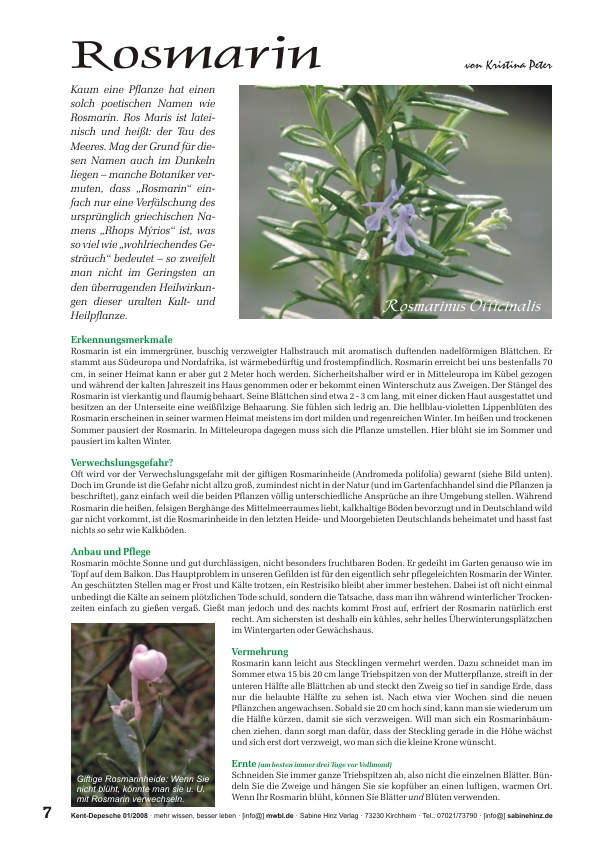 »Kaum eine Pflanze hat einen solch poetischen Namen wie Rosmarin. Ros Maris ist lateinisch und heißt: der Tau des Meeres. Mag der Grund für diesen Namen auch im Dunkeln liegen – manche Botaniker vermuten, dass „Rosmarin“ einfach nur eine Verfälschung des ursprünglich griechischen Namens „Rhops Mýrios“ ist, was so viel wie „wohlriechendes Gesträuch“ bedeutet – so zweifelt man nicht im Geringsten an den überragenden Heilwirkungen dieser uralten Kult- und Heilpflanze.«