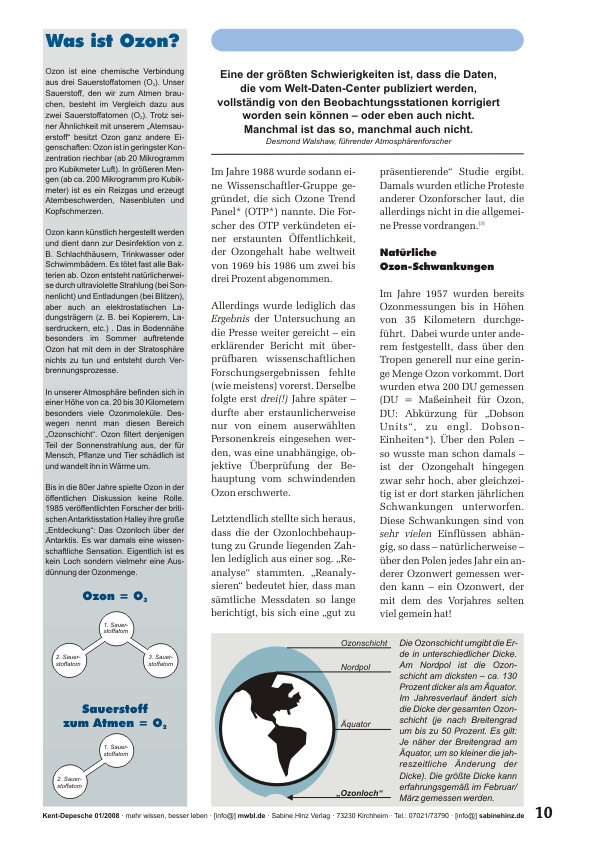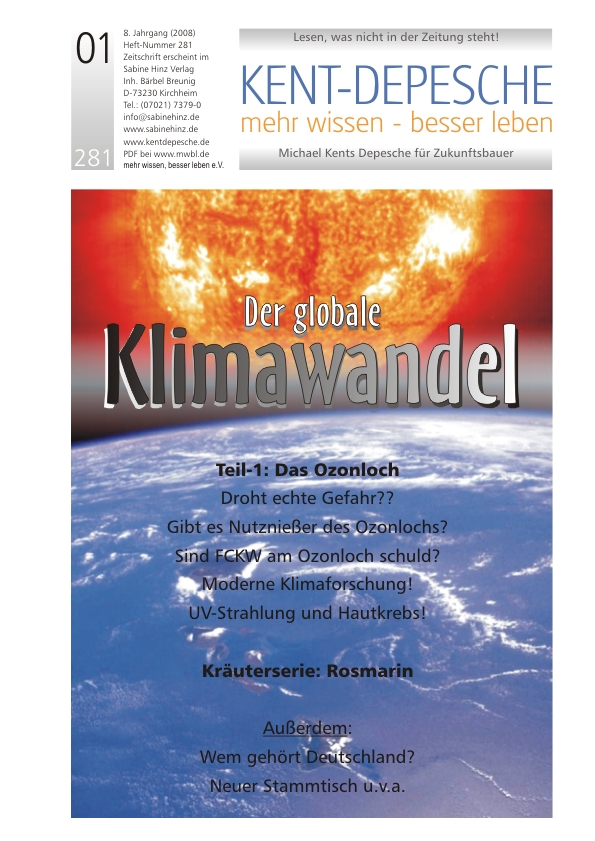 »Noch nie wurde so viel übers Wetter geredet, gesendet, geschrieben und diskutiert wie gegenwärtig. Kohlendioxid (CO2) sei angeblich am Treibhauseffekt schuld, das Ozonloch haben wir uns selbst durch FCKW und andere Übeltäter eingebrockt, und der schon seit vielen Jahren angekündigte Klimawandel vollzieht sich aktuell – leicht erkennbar an all den im letzten Jahrzehnt statt gefundenen Wetterkapriolen wie Flut- und Dürrekatastrophen, Tsunamis und Hurrikans. Das alles ist längst ein alter Hut, jeder weiß das, jeder glaubt das, keiner kann es überprüfen! Doch es gibt auch Wissenschaftler, die ganz anderer Meinung sind... und es gibt Menschen, die auf ganz andere mögliche Ursachen einer Klimaschädigung hinweisen, wie z.B. Massentierhaltung, Gentechnik und E-Smog und Mobilfunkstrahlung. Vielleicht ist ja mal wieder alles anders, als uns das die üblichen Kreise glauben machen möchten? Beginnen wollen wir mit dem allseits gefürchteten Ozonloch, das – laufend größer werdend – unser aller Leben bedrohe, gefährliche UV-Strahlung durchlasse, die unsere Haut verbrenne und somit für zunehmende Hautkrebsraten verantwortlich zeichne…«