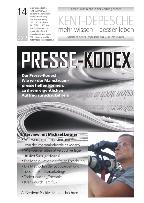 »Der Buchautor und Filmemacher Michael Leitner garniert sein fundiertes Fachwissen zur AIDS- und Virenthematik im heutigen Interview ab Seite 7 mit jeder Menge pfiffigem bzw. gepfeffertem Humor. Doch während Michael neue Fakten zur Vogelgrippe präsentiert, zeigt er nebenbei weitere Facetten der Problematik auf – wie etwa, mit welchen konkreten Methoden Ärzte und Journalisten von der Pharmaindustrie zu Günstlingen degradiert werden, wie die Virenerfindung überhaupt zustande kam ... und vieles Spannende mehr.«
