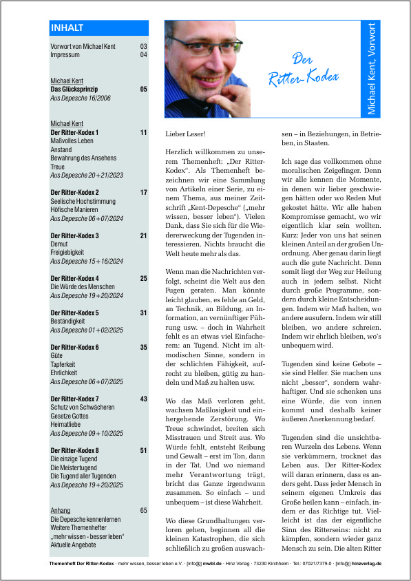 »Tugenden sind keine Gebote – sie sind Helfer. Sie machen uns nicht „besser“, sondern wahrhaftiger. Und sie schenken uns eine Würde, die von innen kommt und deshalb keiner äußeren Anerkennung bedarf. Tugenden sind die unsichtbaren Wurzeln des Lebens. Wenn sie verkümmern, trocknet das Leben aus. Der Ritter-Kodex will daran erinnern, dass es anders geht. Dass jeder Mensch in seinem eigenen Umkreis das Große heilen kann – einfach, indem er das Richtige tut. Vielleicht ist das der eigentliche Sinn des Ritterseins: nicht zu kämpfen, sondern wieder ganz Mensch zu sein. Die alten Ritter nannten das „Ehre“. Es ist dieses stille, aufrechte Gefühl, das sich einstellt, wenn man weiß: Ich habe getan, was richtig war – auch wenn es niemand gesehen hat. Am Ende sind Tugenden nichts anderes als Ausdruck dessen, was der Mensch in seinem besten Zustand ohnehin ist: mutig, gerecht, freigebig, wahrhaftig, liebevoll. Wer sie lebt, kämpft keinen Kampf gegen andere, sondern gewinnt einen stillen Sieg für sich selbst.«