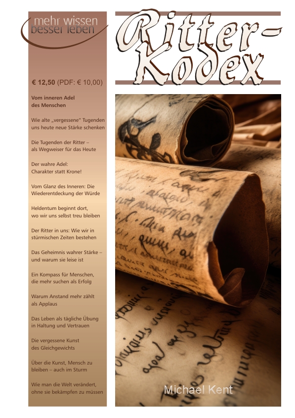 Der „Ritter-Kodex“ ist kein nostalgischer Blick zurück, sondern ein Wegweiser nach vorn – in eine Zeit, die Würde, Mut und Maß dringender braucht als je zuvor. Er erzählt vom stillen Helden in uns allen – vom Menschen, der sich nicht vom Lärm der Welt betäuben lässt, sondern der inneren Stimme folgt. In rund 20 Tugenden – von Treue bis Demut, von Tapferkeit bis Edelmut – wird eine fast vergessene Welt wieder lebendig, in der das Wort noch Gewicht, das Herz noch Richtung und der Mensch noch Maßstab war. Dies ist aber keine Moralpredigt, sondern ein geerdeter, praktischer Leitfaden – eine Einladung, die Würde, die Liebe, ja das Wesen und die „Sprache“ der Seele selbst neu zu verstehen. Wer sich danach sehnt, den Glanz des Inneren wiederzufinden, der wird hier fündig.