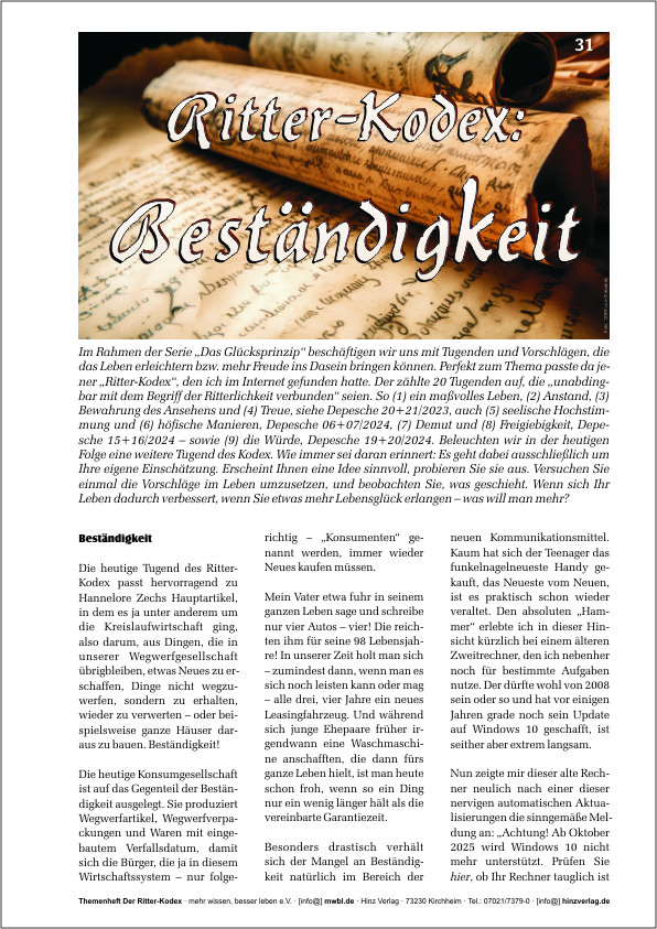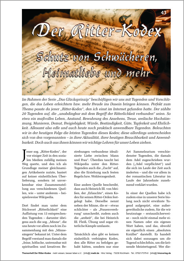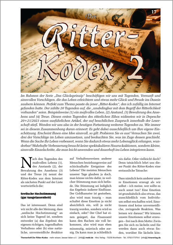 »Tugenden sind keine Gebote – sie sind Helfer. Sie machen uns nicht „besser“, sondern wahrhaftiger. Und sie schenken uns eine Würde, die von innen kommt und deshalb keiner äußeren Anerkennung bedarf. Tugenden sind die unsichtbaren Wurzeln des Lebens. Wenn sie verkümmern, trocknet das Leben aus. Der Ritter-Kodex will daran erinnern, dass es anders geht. Dass jeder Mensch in seinem eigenen Umkreis das Große heilen kann – einfach, indem er das Richtige tut. Vielleicht ist das der eigentliche Sinn des Ritterseins: nicht zu kämpfen, sondern wieder ganz Mensch zu sein. Die alten Ritter nannten das „Ehre“. Es ist dieses stille, aufrechte Gefühl, das sich einstellt, wenn man weiß: Ich habe getan, was richtig war – auch wenn es niemand gesehen hat. Am Ende sind Tugenden nichts anderes als Ausdruck dessen, was der Mensch in seinem besten Zustand ohnehin ist: mutig, gerecht, freigebig, wahrhaftig, liebevoll. Wer sie lebt, kämpft keinen Kampf gegen andere, sondern gewinnt einen stillen Sieg für sich selbst.«