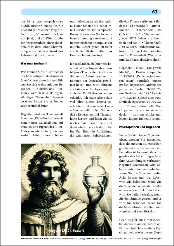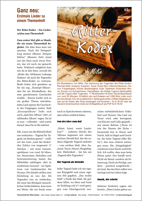 Zum ersten Mal begleitet Musik ein Themenheft. Zu jeder Tugend habe ich ein Lied getextet und komponiert – 18 an der Zahl. Worte können nur erklären, Musik kann man fühlen. Worte richten sich an den Verstand. Musik berührt das Herz, spricht zur Seele. Hier mehr dazu.