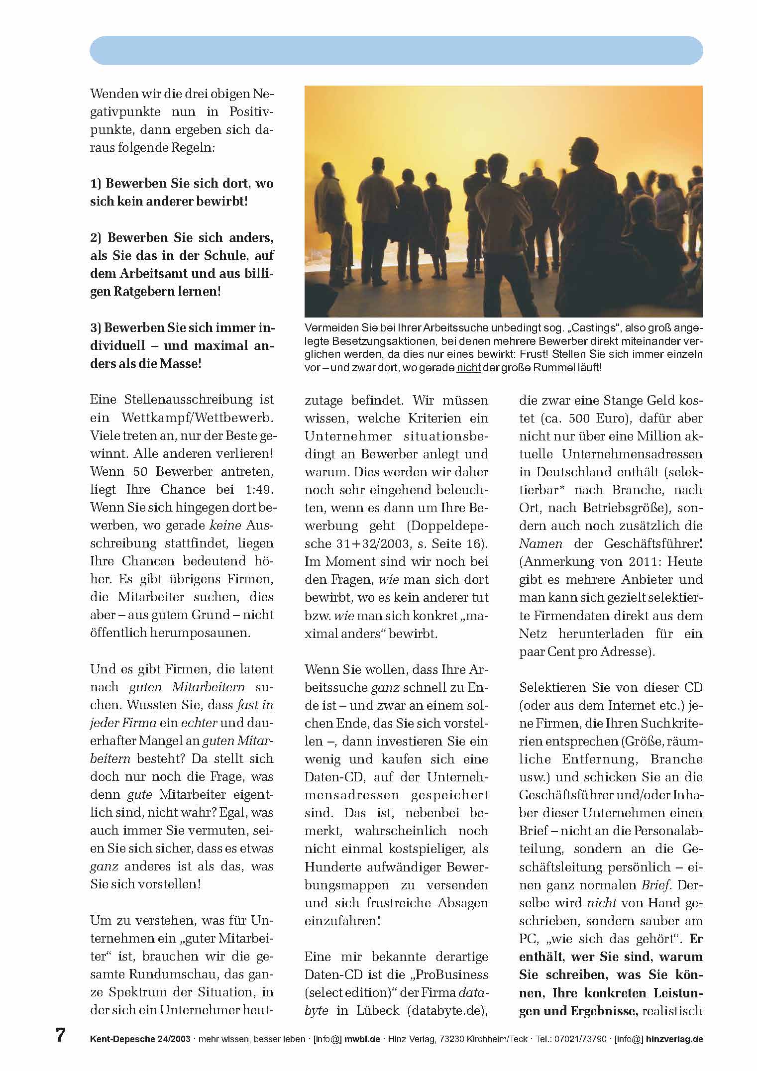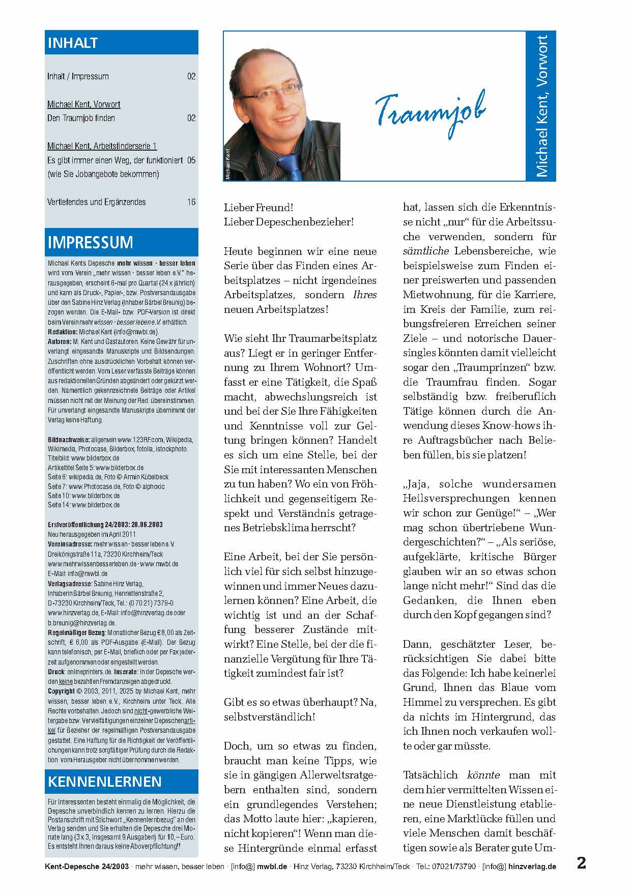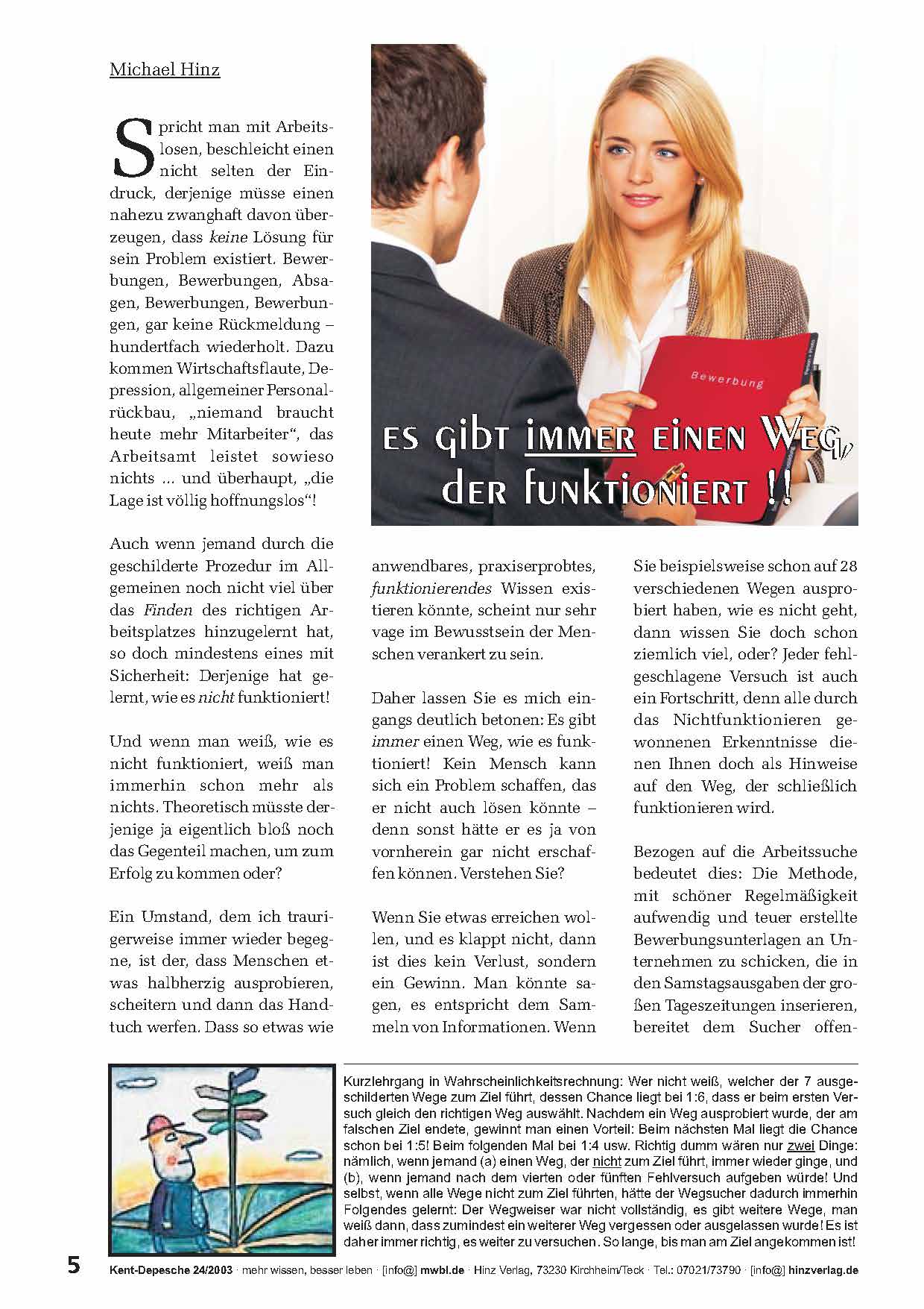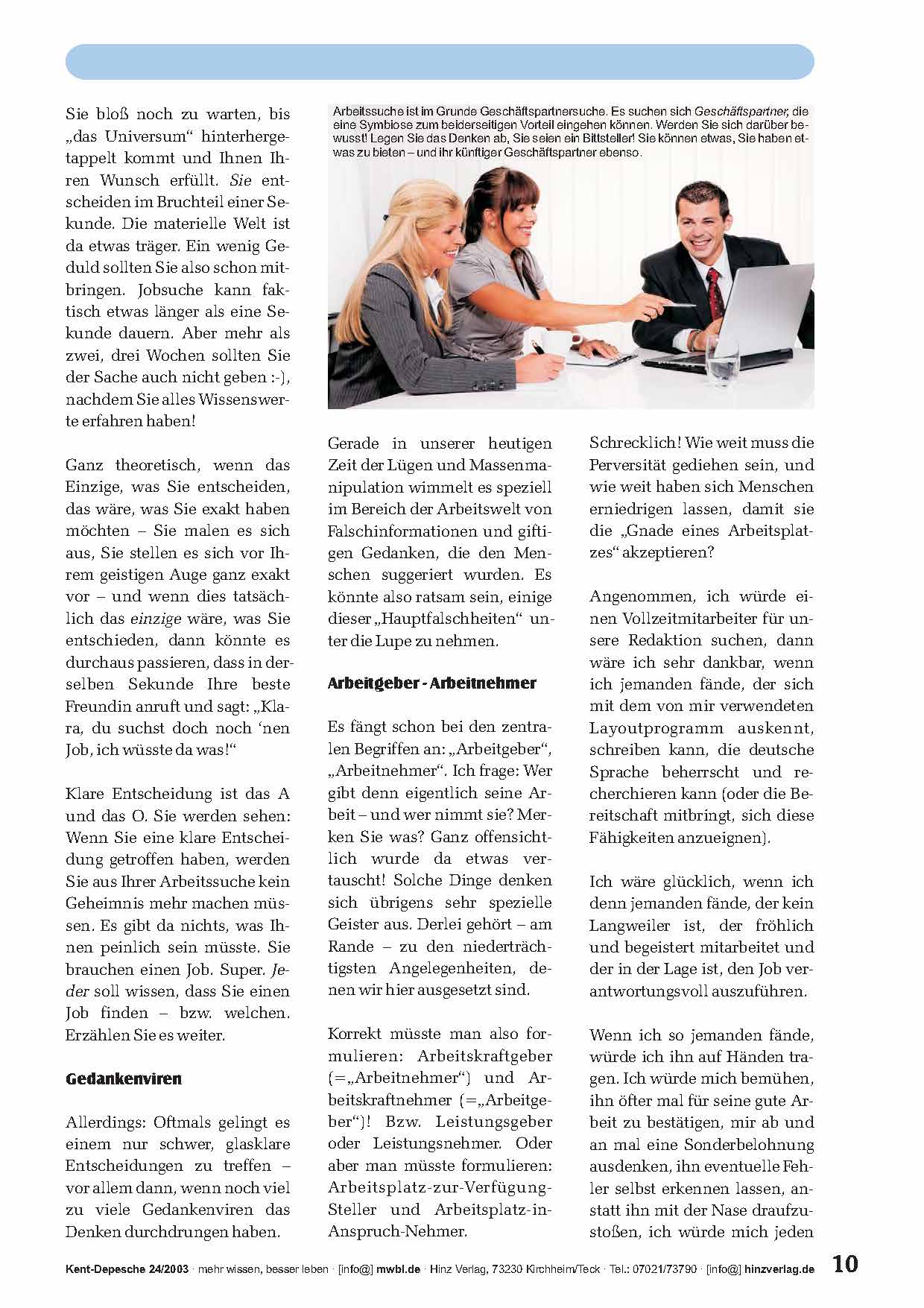 »Heute beginnen wir eine neue Serie über das Finden eines Arbeitsplatzes – nicht irgendeines, sondern Ihres neuen Arbeitsplatzes! Wie sieht Ihr Traumarbeitsplatz aus? Liegt er in geringer Entfernung zu Ihrem Wohnort? Umfasst er eine Tätigkeit, die Spaß macht, abwechslungsreich ist und bei der Sie Ihre Fähigkeiten voll zur Geltung bringen können? Handelt es sich um eine Stelle, bei der Sie mit interessanten Menschen zu tun haben? Wo ein von Fröhlichkeit und gegenseitigem Respekt und Verständnis getragenes Betriebsklima herrscht? Eine Arbeit, bei der Sie persönlich viel für sich selbst hinzugewinnen und immer Neues dazulernen können? Eine Arbeit, die wichtig ist und an der Schaffung besserer Zustände mitwirkt? Eine Stelle, bei der die finanzielle Vergütung für Ihre Tätigkeit fair ist? Gibt es so etwas überhaupt? Na, selbstverständlich! Doch, um so etwas zu finden, braucht man keine Tipps aus Allerweltsratgebern, sondern ein Verständnis gewisser Prinzipien und Hintergründe. Sobald man diese einmal erfasst hat, lassen sich die Erkenntnisse für nahezu sämtliche Lebensbereiche verwenden, wie beispielsweise für die Karriere, im Kreis der Familie, zum reibungsfreieren Erreichen seiner Ziele ...«